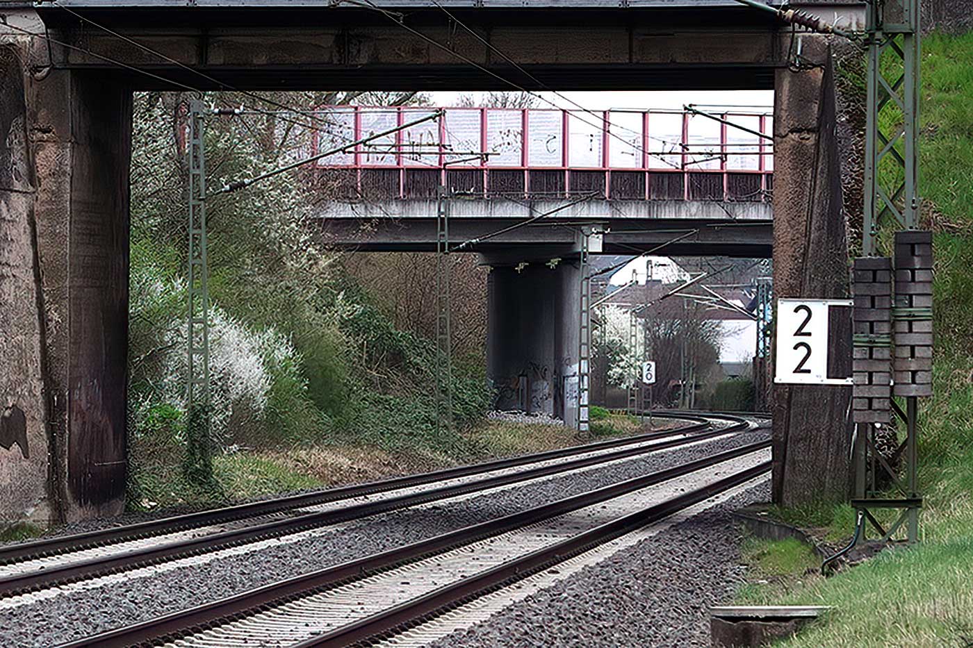 km 1,8 (Stein und Tafel) und km 1,9 (Stein) zwischen Abzw Hanau Rauschwald und Großkrotzenburg - Blick Richtung Großkrotzenburg