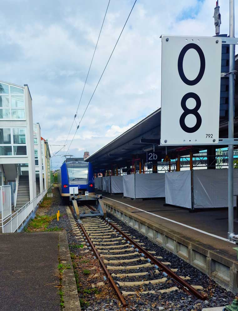 km 0,0 der Strecke Friedrichshafen Stadt 0,0 - Oberteuringen 10,42 - (Streckenende 10,614) | ||
