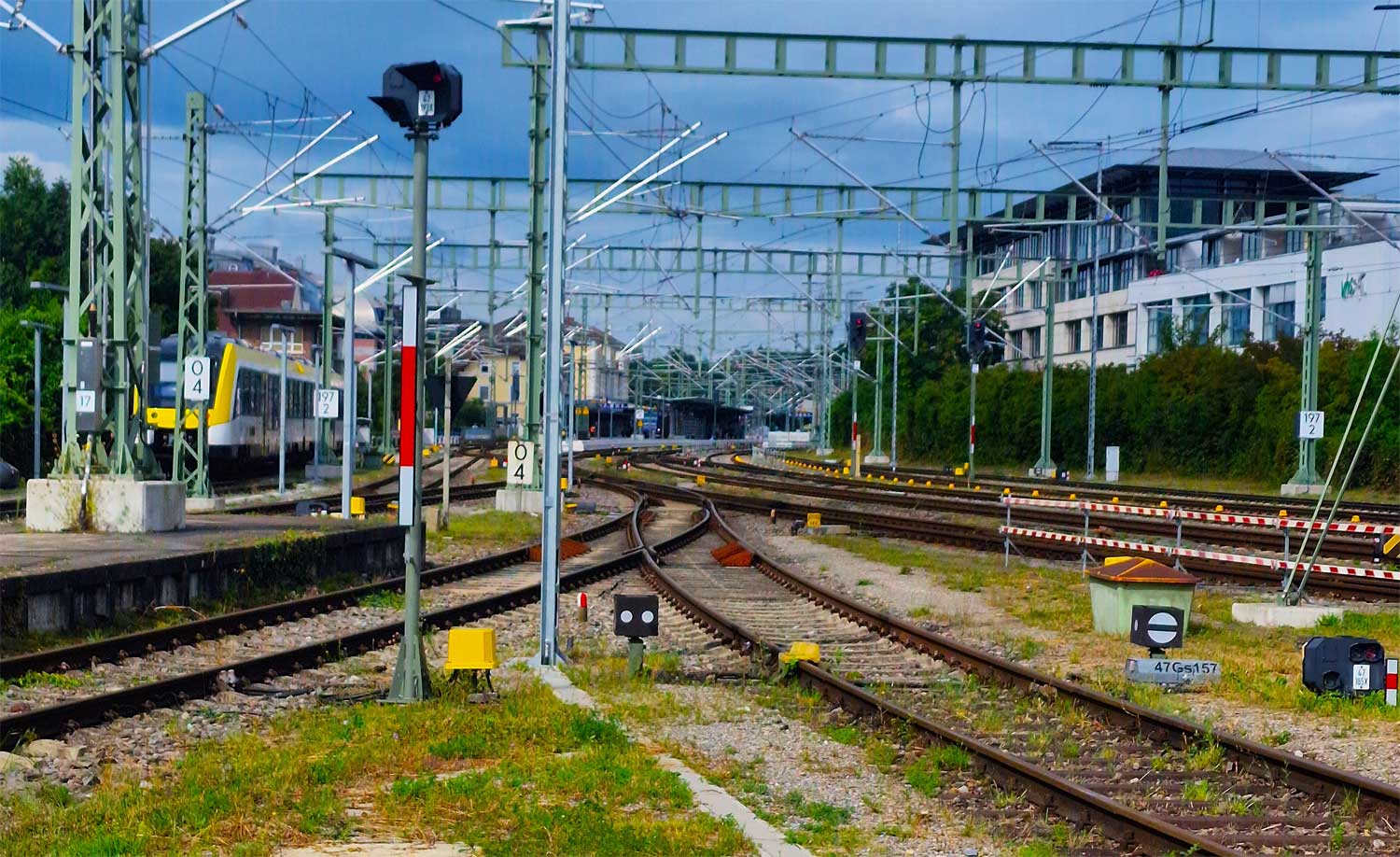 Im Hintergrund links St. Canisius und rechts das Stellwerk FrHafen 4 für den Fährenbetrieb nach der Schweiz.