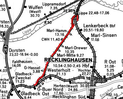 Marl Lippe | 16,89 | km 22,39 der Strecke Wanne-Eickel Hbf 0,26 - Münster Hbf 67,64 - Osnabrück Hbf 117,71 - Bremen Hbf 239,75 - Hamburg Hbf 355,32 |