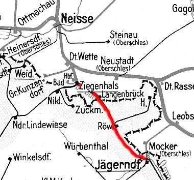 km 55,61 der Strecke Ratibor Hbf 0,0 - Bauerwitz 24,37 - Leobschütz 37,70 - Grenze Schlesien/Sudetengau 52,26 - Jägerndorf 55,61