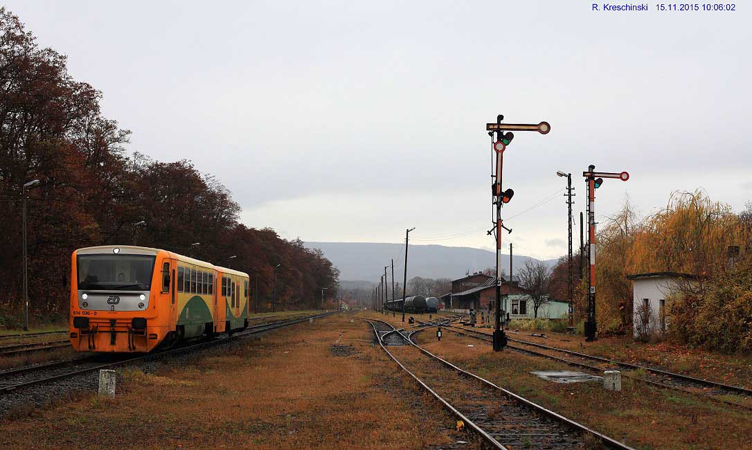 Links km 0,0 der Strecke Krnov (Jägerndorf) -0,779 - Jindřichov ve Slezsku (Hennersdorf) 21,645 - Grenze Tschechien/Polen 25,694 = km 11,225 - Głuchołazy (Ziegenhals Hbf) 0,0