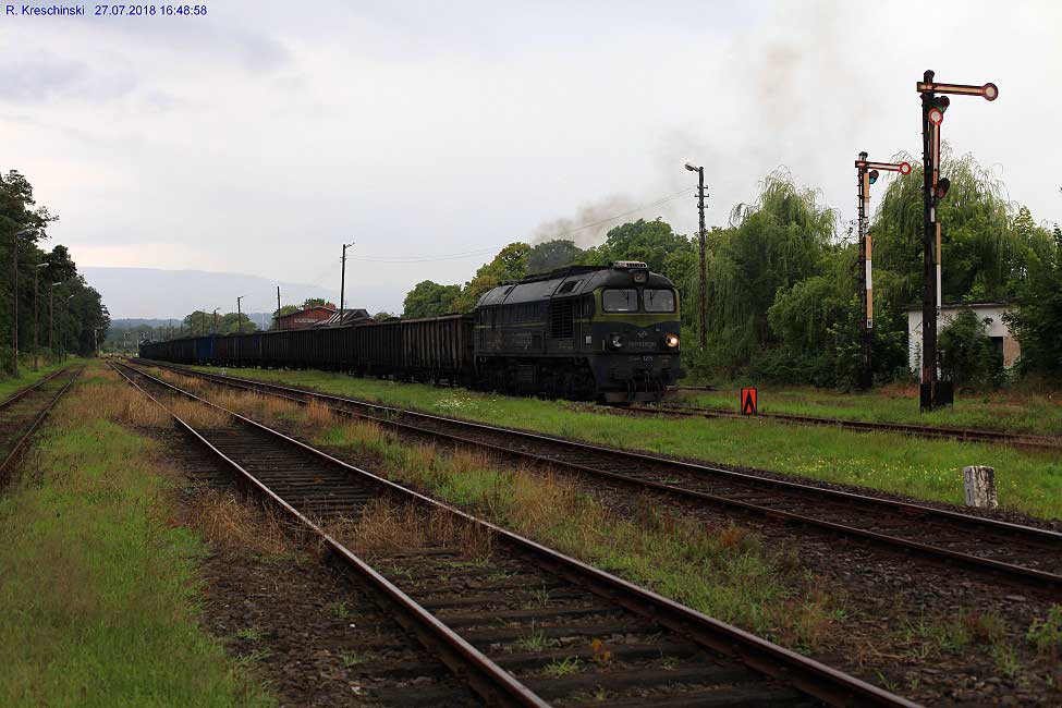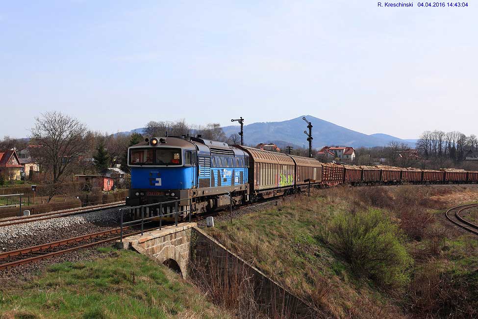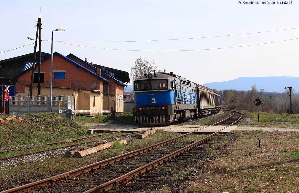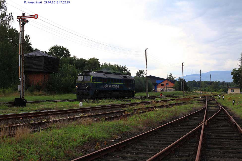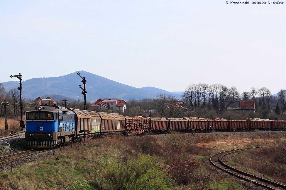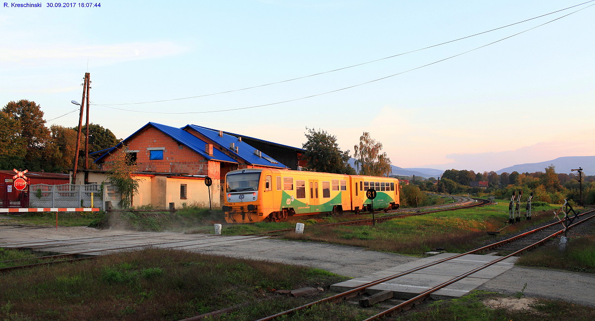 Der Zug der CD kommt von Hanušovice (Hannsdorf) - Jeseník (Freiwaldau-Gräfenberg), befindet sich hier auf polnischem Gebiet und und fährt nach dem Kopfmachen auf dem daneben liegenden Gleis zurück auf tschechisches Gebiet in Ri Jeseník (Freiwaldau-Gräfenberg) - Hanušovice (Hannsdorf).