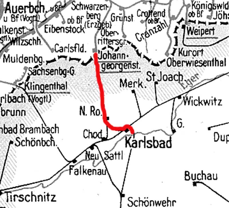 Karlsbad unter Bahnhof 0,0 - Breitenbach (Sudetenland) 45,828 - Grenze Sudetenland/Deutschland 46,12