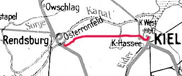 Osterrönfeld | 31,11 | km 105,16 der Strecke( Hamburg-Altona 0,70) - Elmshorn 30,70 - Wrist 52,23 - Neumünster 74,69 - Schleswig 138,39 - Jübek 149,43 - Flensburg-Weiche 172,92 - Staatsgrenze km 179,784 - [Padborg (Pattburg)] |