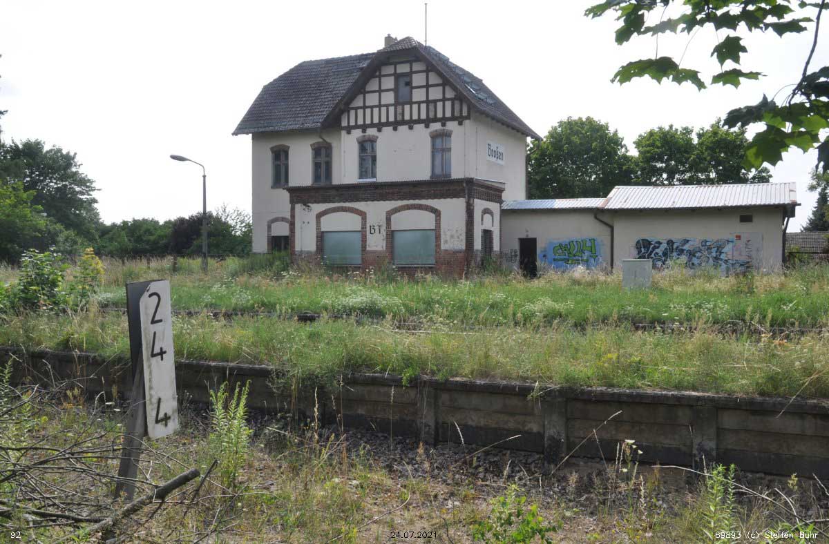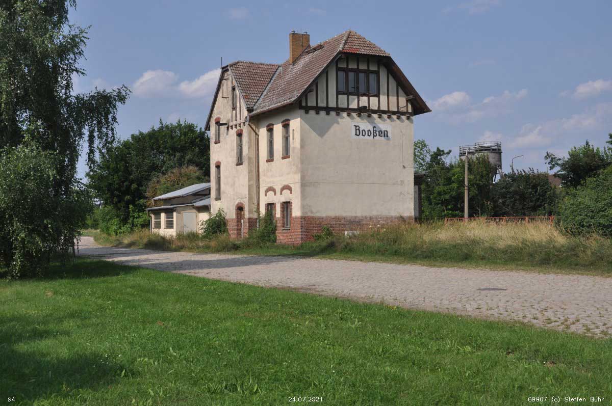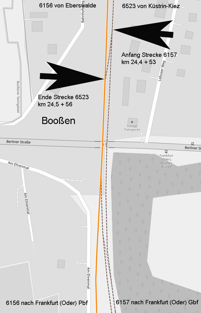 Booßen | 24,39 | km 124,98 der Strecke [Berlin Nordbf (bis 1950 Berlin Stettiner Bf) -0,28 - Streckenunterbrechung - Berlin-Pankow 5,60] - Eberswalde 45,24 (Abzw. von Strecke 2) - Wriezen 75,57 - Frankfurt (Oder) Pbf 131,11 |