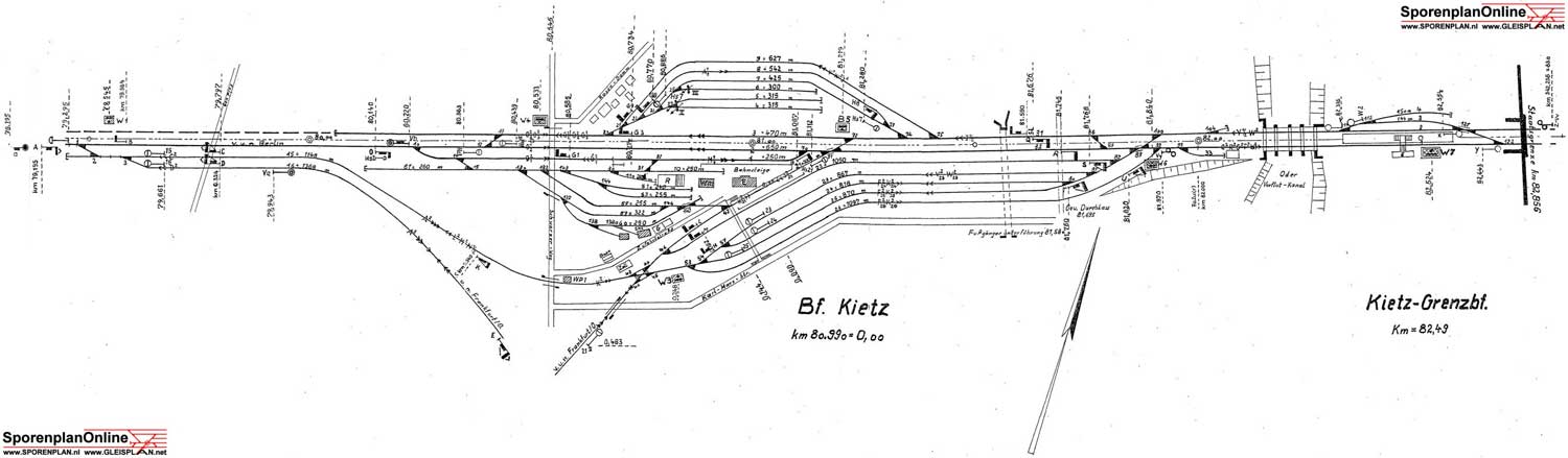 Kietz | 0,0 | km 80,99 der Strecke Berlin Ostbf -0,20 - Küstrin Altstadt 82,49 - Grenze Deutschland/Polen 82,996 = [km 342,26 - Kostrzyn Osob (Küstrin Neustadt Hbf) 340,362 - Tczew (Dirschau) 0,0] |