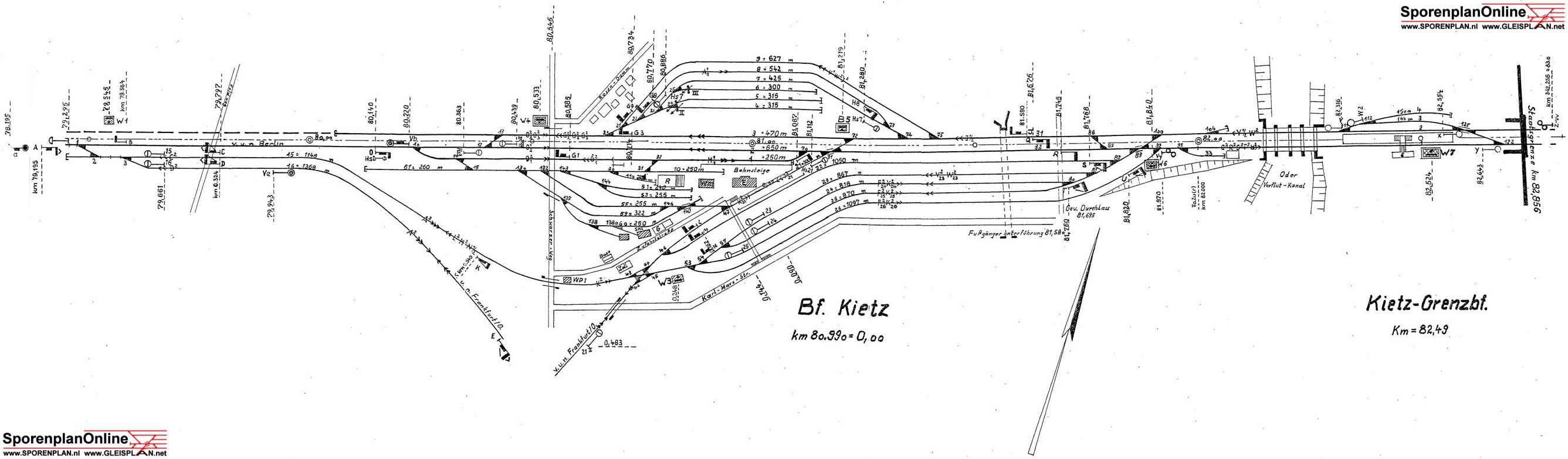 km 80,99 der Strecke Berlin Schlesischer Bf -0,20 - Küstrin Neustadt 84,72 - Kreuz 187,28 - Schneidemühl Pbf 245,66 - Dirschau 426,10 - Elbing 472,56 - Königsberg (Pr) Hbf 591,15 (kommend)/588,87 (gehend) - Insterburg 680,25 - Eydtkuhnen 741,73 - Reichsgrenze 742,33 - [Wirballen (Virbalis) - Kaunas (Kowno) - Wilna (Wilno)] | ||