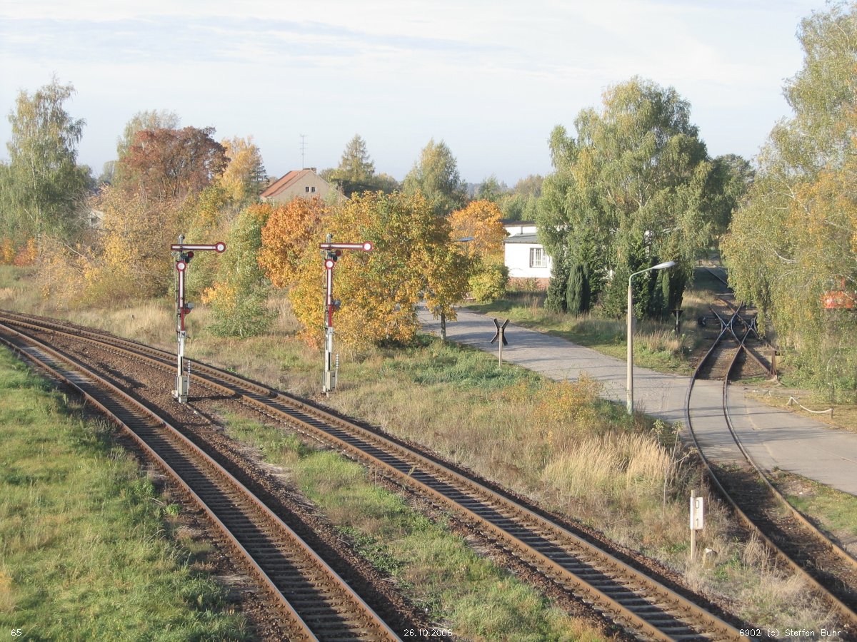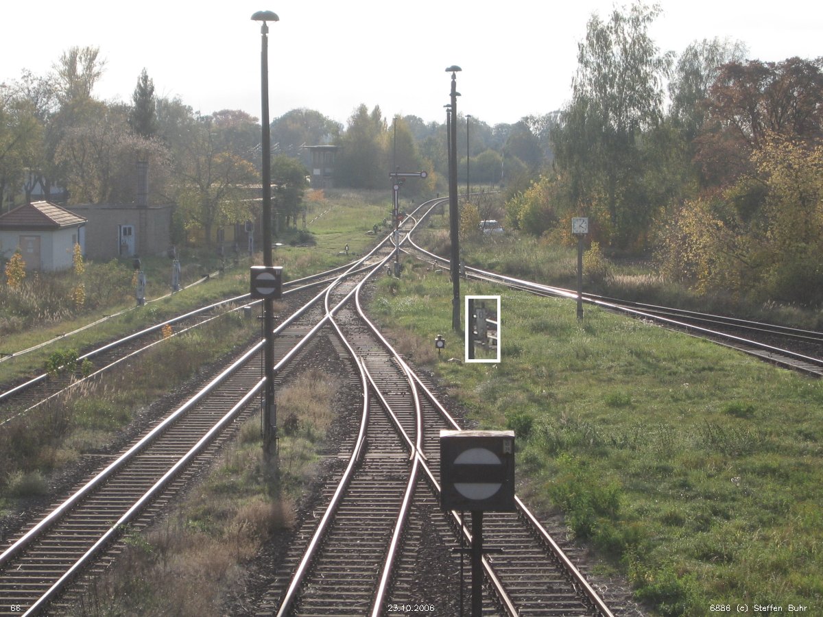 km 152,79 der Strecke Großenhain Cottb. Bf 0,0 - Senftenberg 45,29 - Cottbus 79,67 - Frankfurt (Oder) Pbf 152,85 (Personenzuggleise)/152,79 (Güterzuggleise) | ||