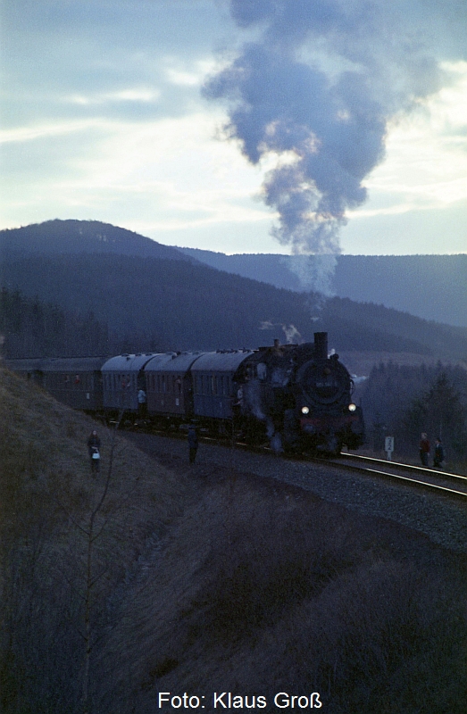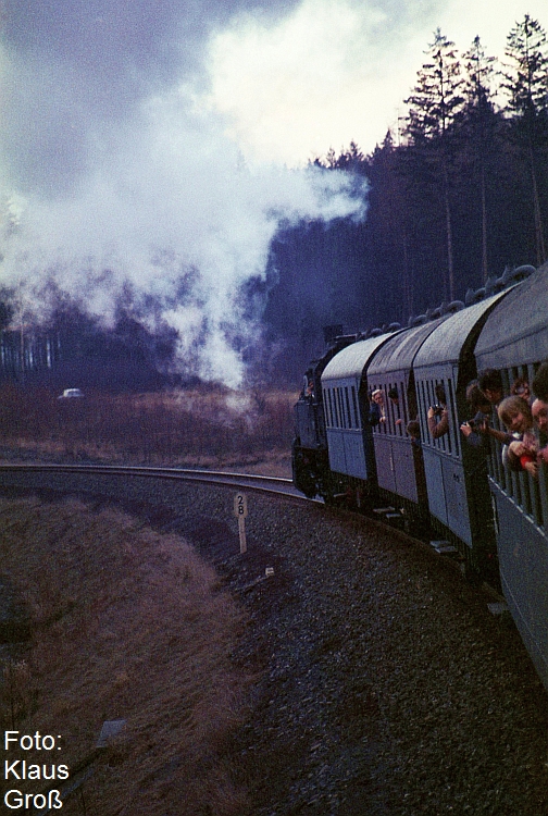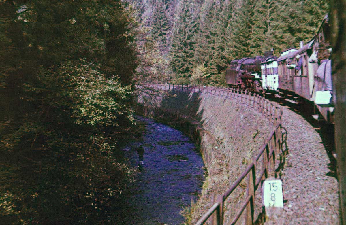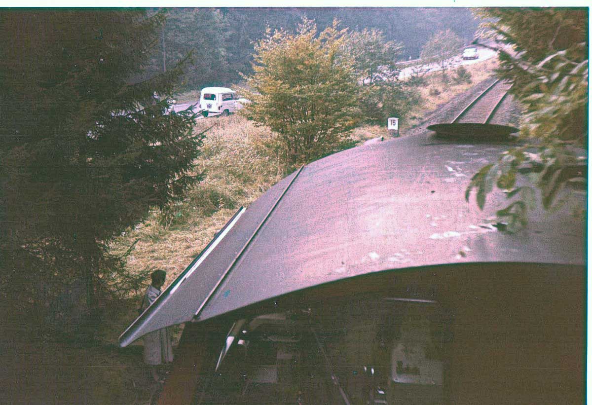 Der schändliche übereilte Abriß der Innerstetalbahn begann im Endbahnhof Altenau (Oberharz) im April 1978. Altenau, Clausthal-Zellerfeld, Frankenscharrnhütte und Wildemann waren inzwischen schon schienenlos, als im Oktober 1979 hier die "Abriß-Lok" 290 362-3 entgleiste , weil der Schienen-Abriß schon weiter fortgeschritten war, als der Lokführer wußte.