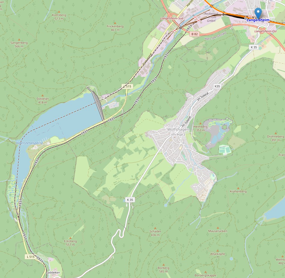 Langelsheim 0,0 km 89,07 der Strecke (Helmstedt 0,0) - Neuekrug-Hahausen 79,21 (kommend)/79,22 (gehend) - Langelsheim 89,07 - Goslar 95,39