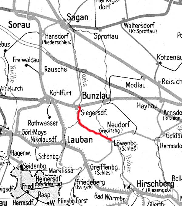Siegersdorf 22,74 km 236,66 der Strecke (Berlin Schlesischer Bf 0,10) - Kohlfurt 224,22 - Arnsdorf (b Liegnitz) 285,71 - Liegnitz 295,25 - Breslau-Mariahöfchen 353,36 - Breslau Hbf 360,21