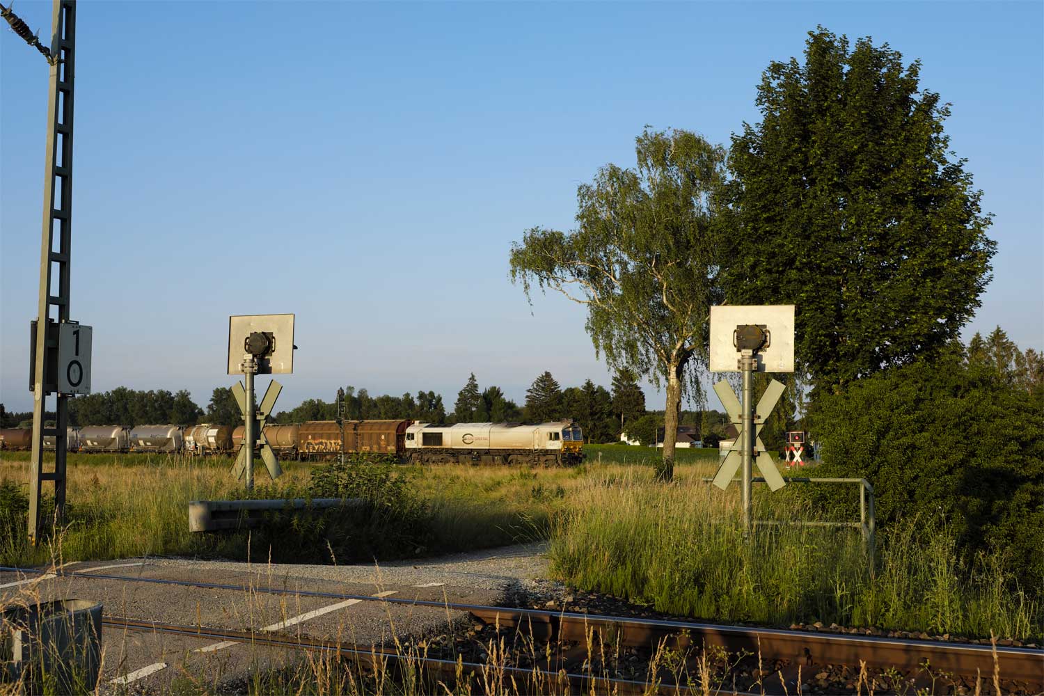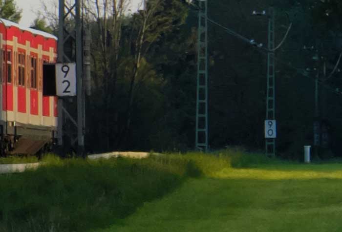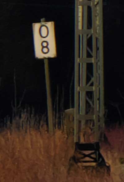 km 0,6 (am Zugende) und km 0,8 (Tafel und Stein am Oberleitungsmast) bei Markt