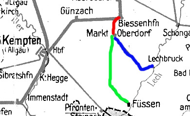 Die Strecke Marktoberdorf - Lechbruck wurde 1899 von den Königlich Bayerischen Staats-Eisenbahnen gebaut. Die Kilometrierung wurde nicht etwa weitergeführt, sondern begann ebenfalls in Marktoberdorf. Diese Strecke wurde bereits 1963 stillgelegt.