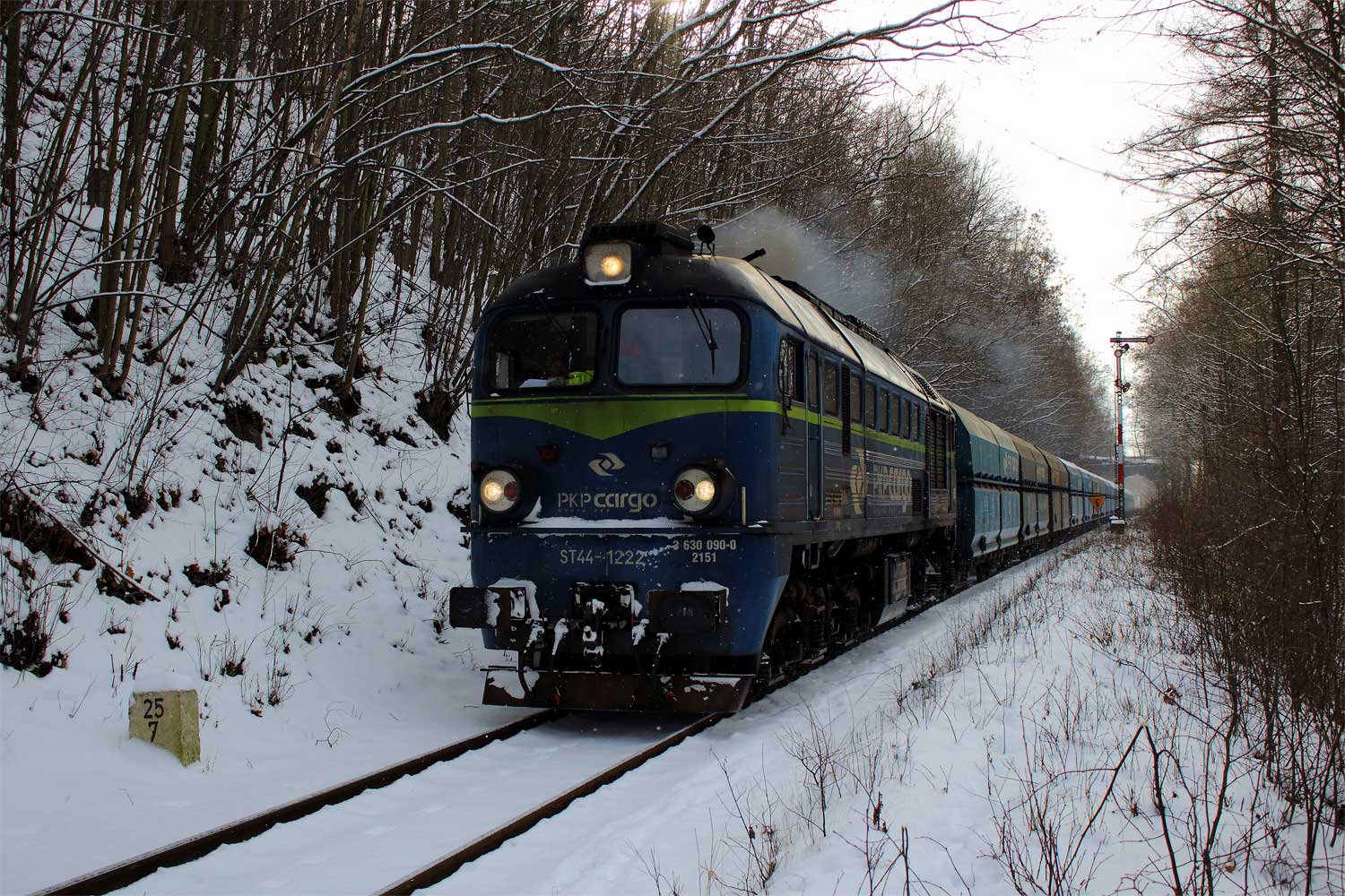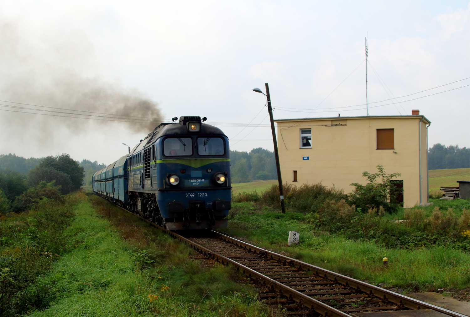 km 8,3 am Abzw Wilka - ST44-1223 mit Kalk-Leerpendel in Richtung Sulików (Schönberg)