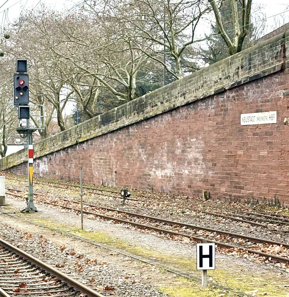 | km -1,16 der Strecke Neustadt (Weinstr) Hbf -1,16 - Bad Dürkheim 13,51 - Grünstadt 28,45 - Monsheim 38,04 | ||