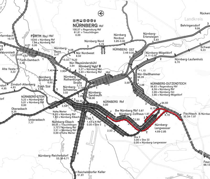 km 2,85 der Strecke Nürnberg Rbf, Stw 22, km 0,0 - Nürnberg-Langwasser 2,85 | ||