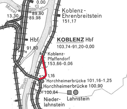Abzw Horchheimer Brücke | 1,25 | km 101,04 der Strecke Wetzlar 0,0 - Limburg (Lahn) 52,17 - Koblenz Hbf 103,74 |