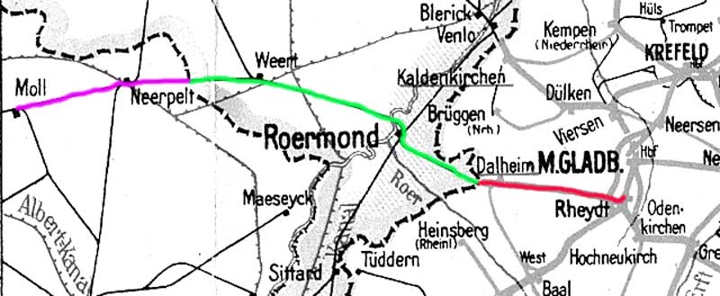 Rheydt P 0,0 - Dalheim 20,13 - Grenze Deutschland/Niederlande 21,26 = [km 102,2 - Roermond 88,6 - Weert 64,0 - Grenze Niederlande/Belgien 54,0 = km 31,7 - Mol 0,0]