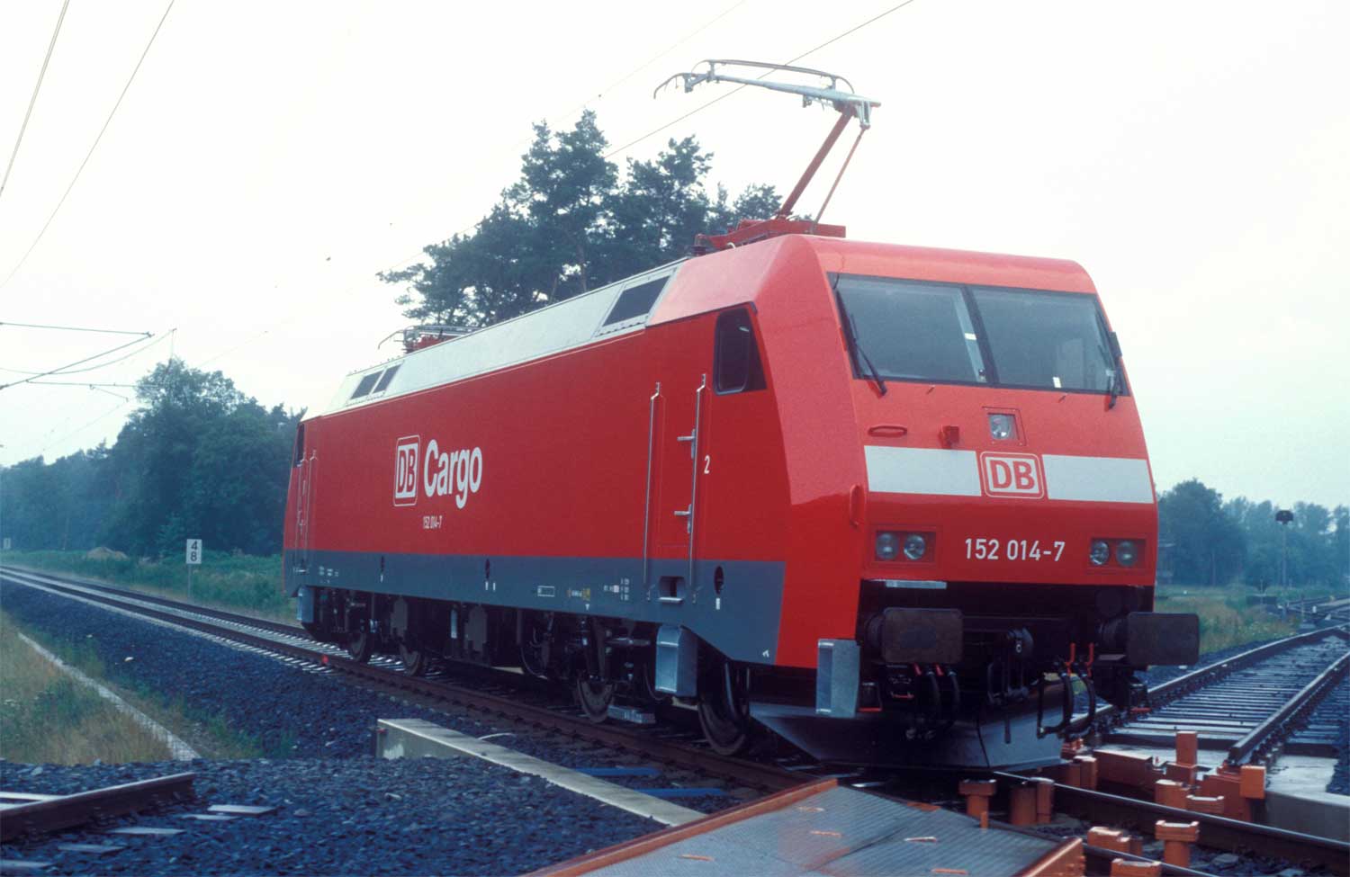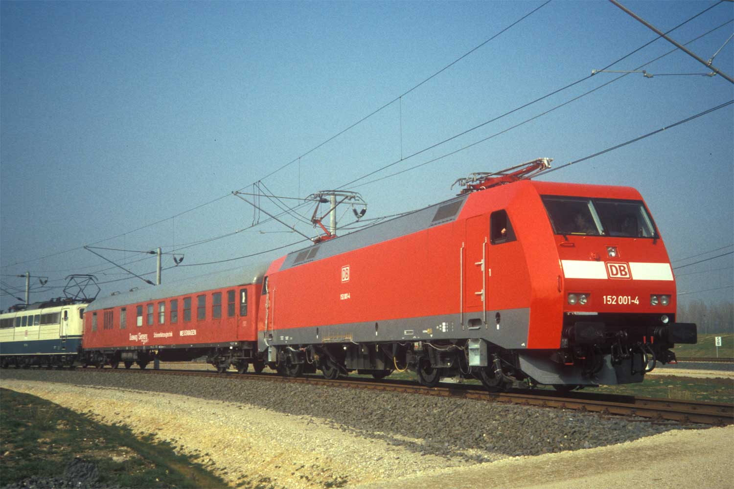 Messzug: vorne 152 001, dann der Messwagen 50 80 09-40 056-7P (ein BDm 028), gefolgt von den beiden Bremsloks 151 151 und 151 156.