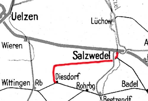 Salzwedel Neustadt 0,0 - Diesdorf 36,2 (Altm) (bis 1927 Spurweite 1000 mm, dann Normalspur) (Salzwedeler Eisenbahn)