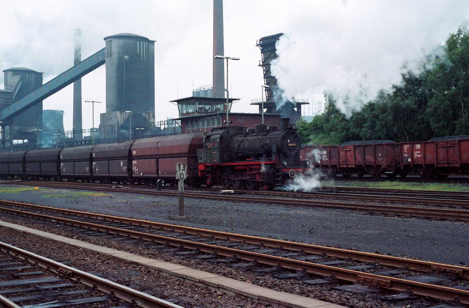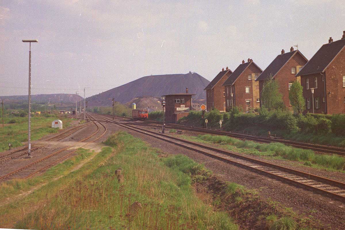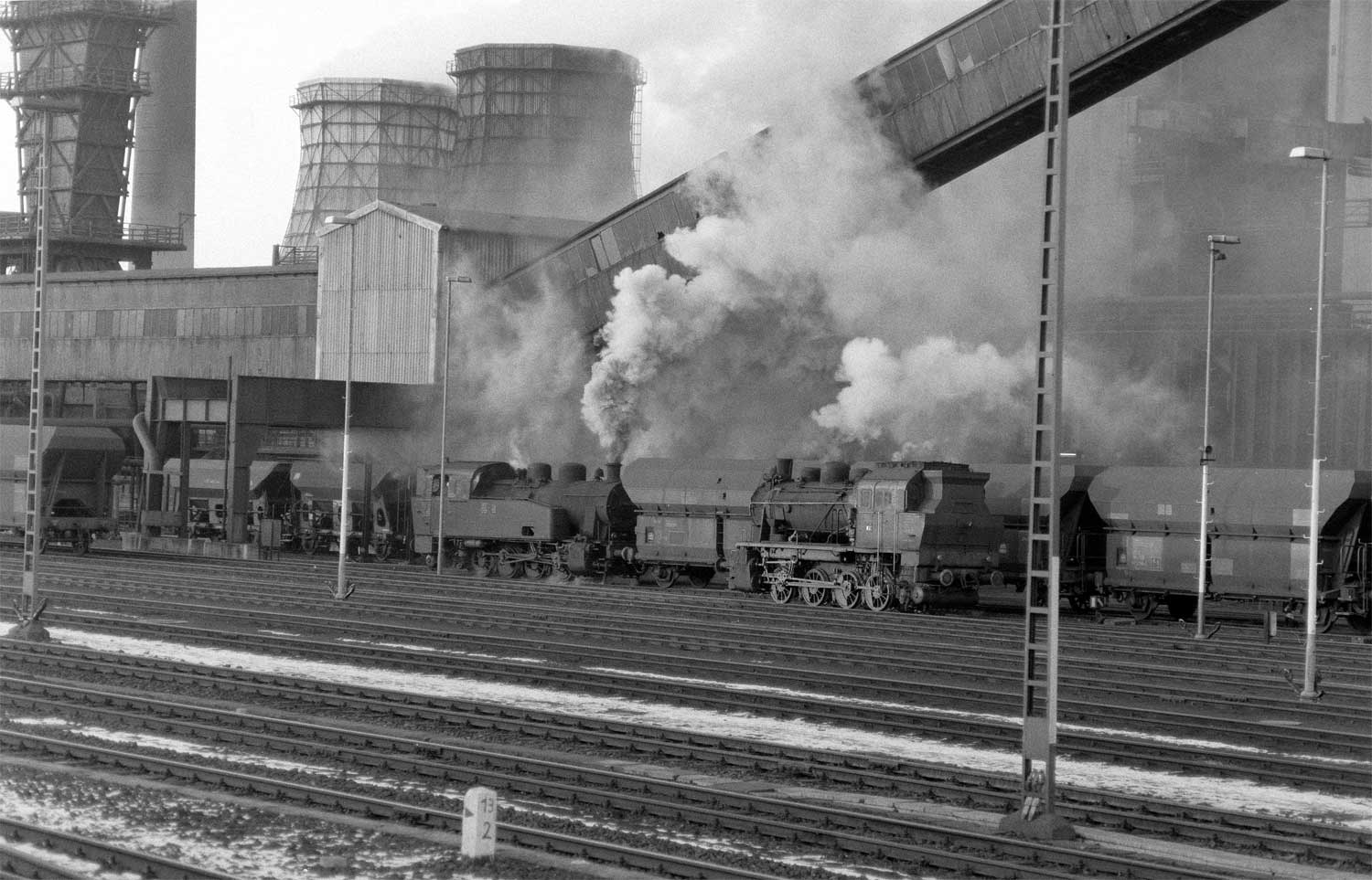 Am 30. April 1984 röhrten 212 105 und 212 069 (rot) mit einem Kohlezug aus Siersdorf durch den schon von Rückbaumaßnahmen der Bundesbahn gezeichneten Merksteiner Güterbahnhof, der gelegentlich nach einer anderen, bereits vergangenen Grube auch „Bahnhof Nordstern“ genannt wurde.