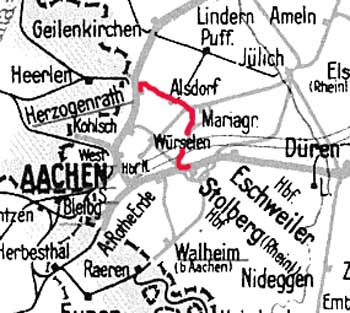 Die Brücke hinter dem ETA führte über die Strecke Aachen Nord -0,02 - Würselen 5,84 - Mariagrube 11,93 - Jülich 27,62