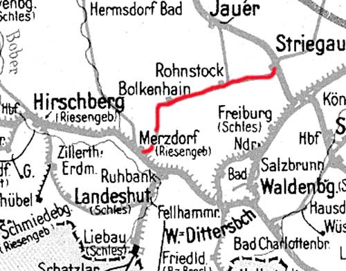 Merzdorf (Riesengeb) | 37,34 | km 318,52 der Strecke Berlin Schlesischer Bf 0,10 - Frankfurt (Oder) Pbf 81,20 - Sommerfeld 156,83 - Gassen 162,43 - Kohlfurt 224,22 - Lauban 245,97 - Hirschberg (Riesengeb) Hbf 297,92 - Waldenburg-Dittersbach 344,83 - Glatz Hbf 395,83 |