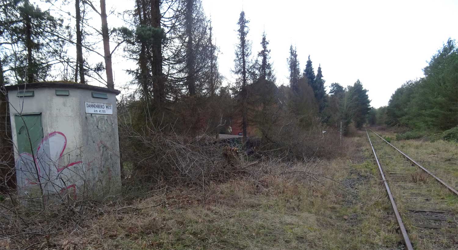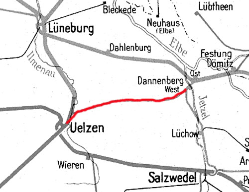 Dannenberg West | 42,04 | km 33,30 der Strecke Salzwedel 0,0 - Streckenunterbrechung - Grenze DDR/BRD 6,13 - Streckenunterbrechung - Wustrow (Han) 10,65 - Dannenberg Ost 36,24 |