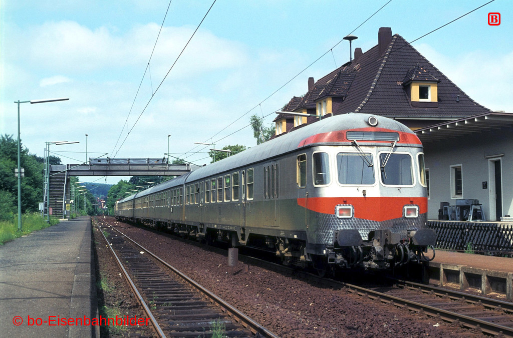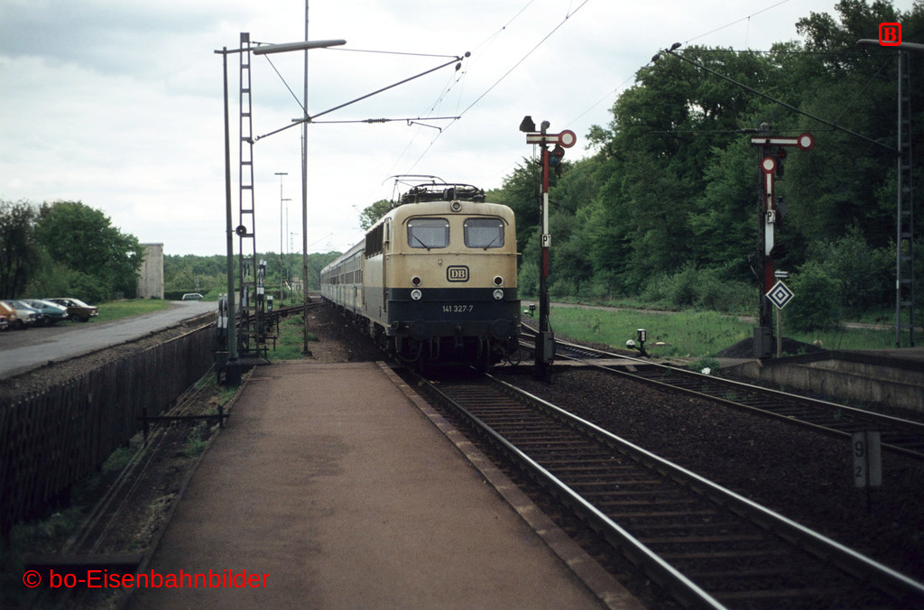 Wennigsen (Deister) noch mit Formsignalen, km-Schild 5,0 am Gittermast - 141 088 schiebt ihren aus einem Prototyp-Bn und LHB-Prototyp-Wagen bestehenden Wendezug N4839 am 21.04.1988 aus dem Bahnhof Wennigsen (Deister) in Richtung Hannover.