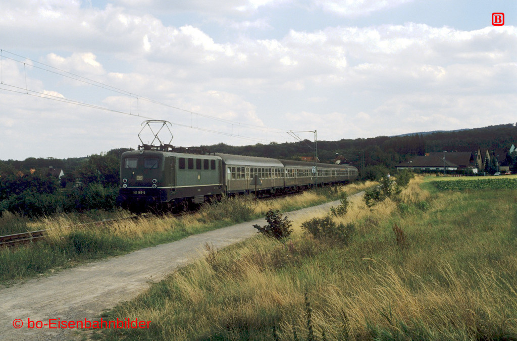 zwischen Egestorf (Deister) und Kirchdorf (Deister), km-Schild 10,6 am Gittermast - 141 168 am 13.08.1989 mit N4822 zwischen Kirchdorf und Egestorf auf der Deisterstrecke.