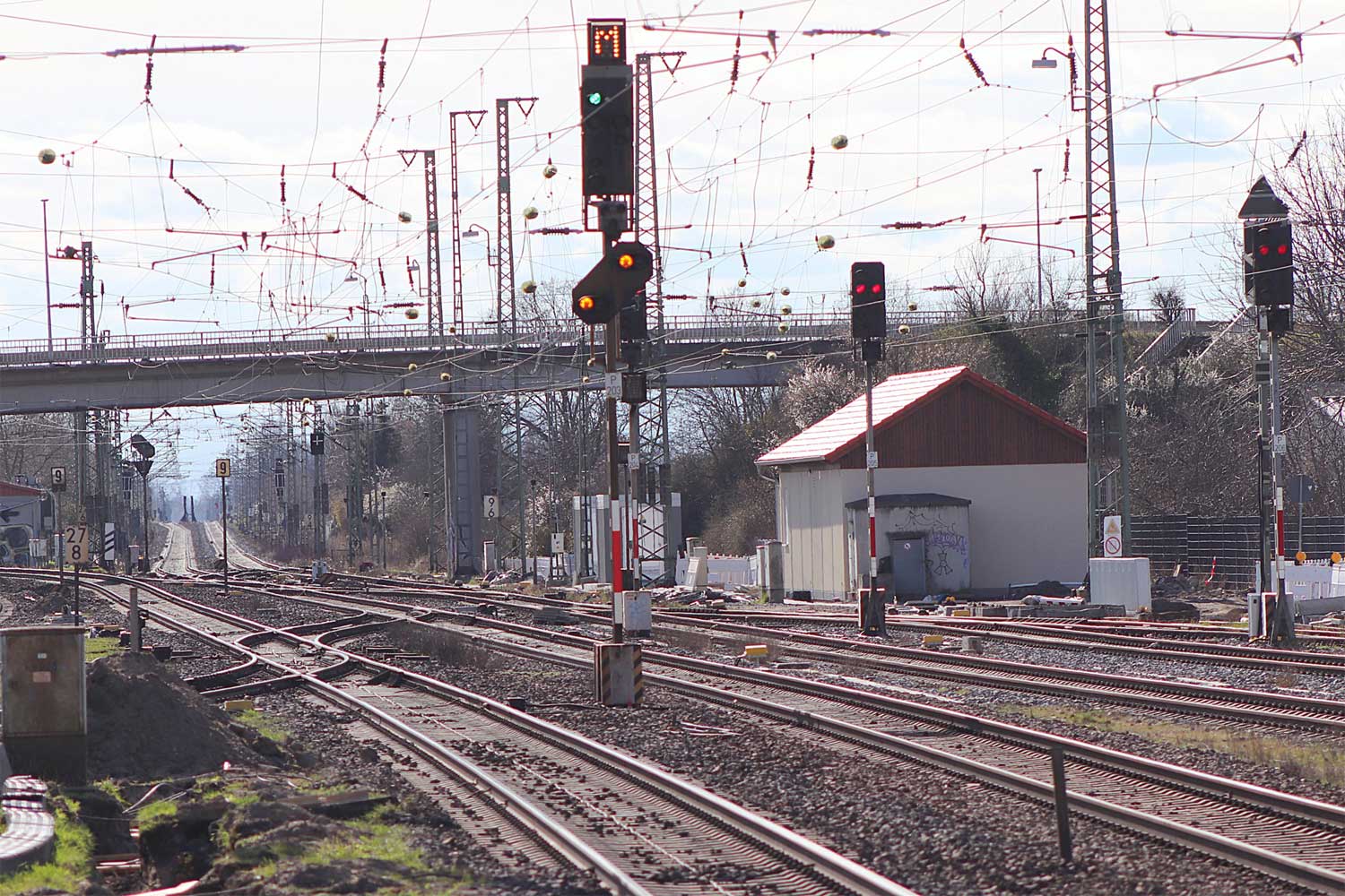 km 0,4; km 0,6 und km 0,8 in Worms Hbf - Blick Richtung Biblis