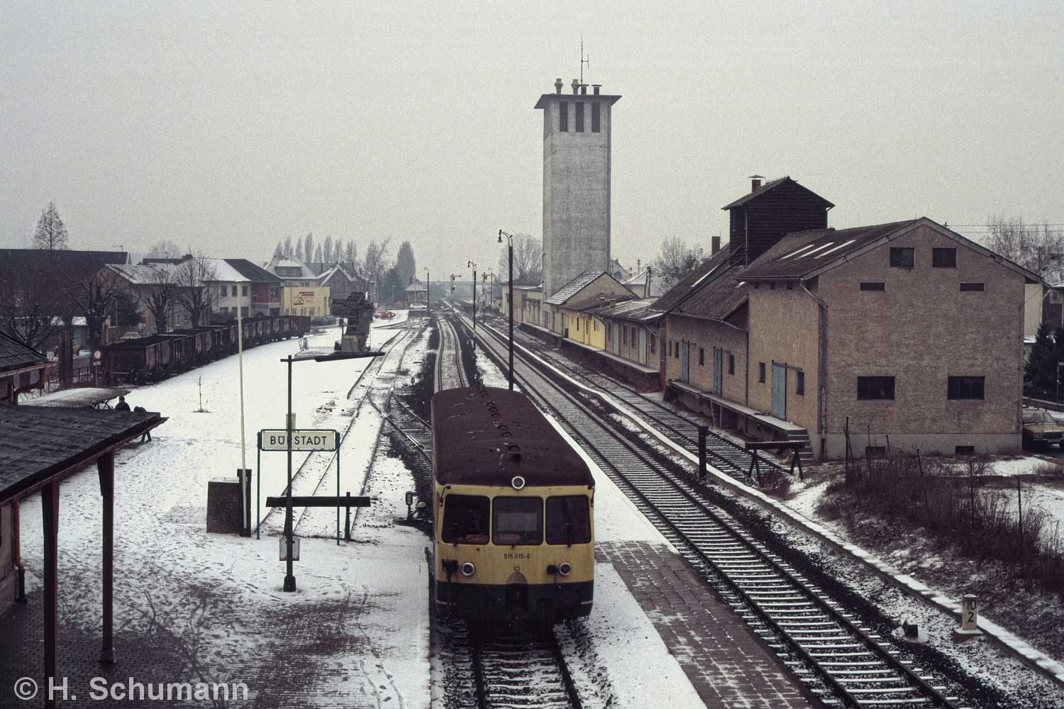 Bürstadt | 10,21 | km 22,95 der Strecke Mannheim Hbf 0,0 - Lampertheim 17,55 - Biblis 28,11 - Goddelau-Erfelden 45,71 - Groß Gerau-Dornberg 54,46 - Frankfurt (Main)-Sportfeld 74,76 |