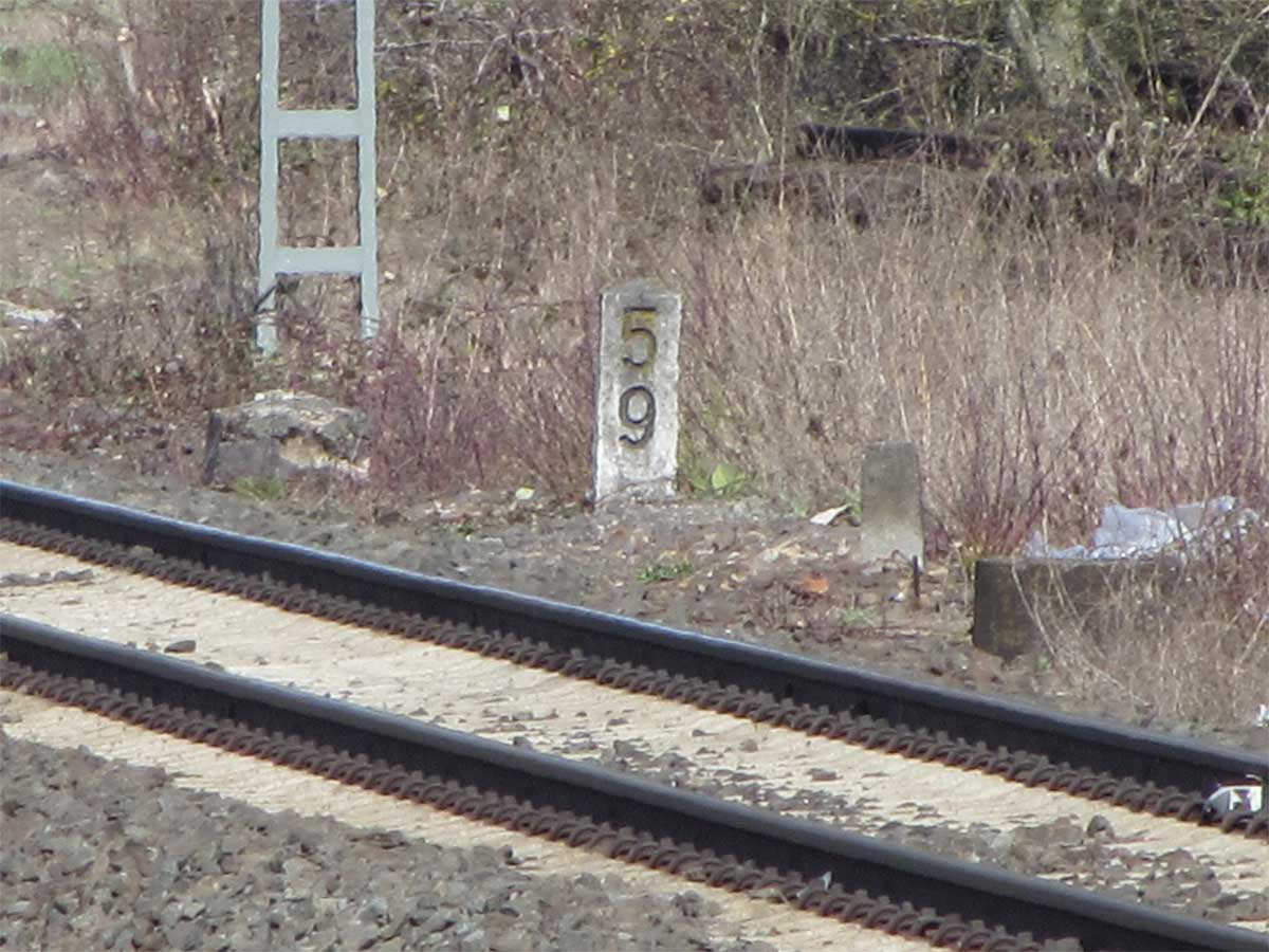 ► | km 5,61 der abgehenden Strecke Worms Hbf 0,0 - Hofheim (Ried) 5,61 - Biblis 10,04 mit weiterlaufender Kilometrierung (Streckenverzweigung mit gemeinsamen Nullpunkt Worms Hbf) | |