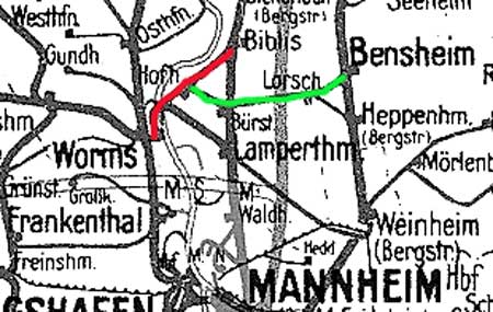 Lorsch | 18,18 | [km 0,0 der Strecke Lorsch 0,0 - Heppenheim (Bergstr) 5,87] bereits in den 30-iger Jahren stillgelegt |