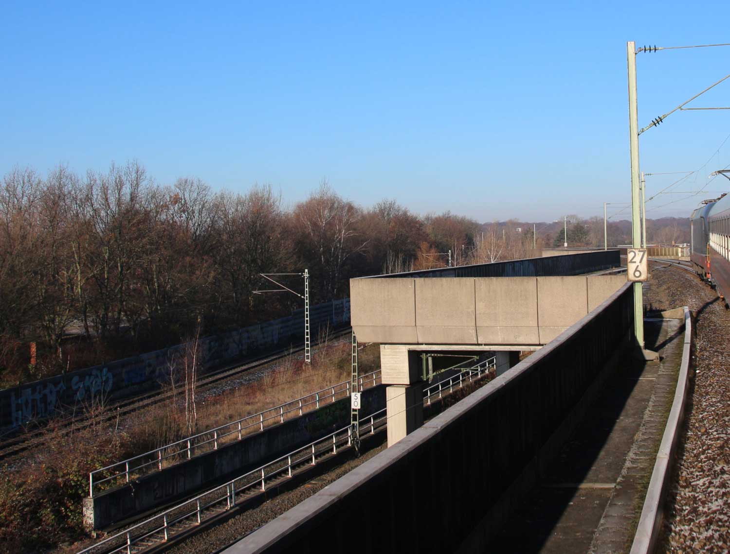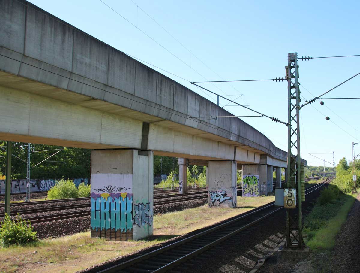 km 5,0 (zwischen den Brückenpfeilern) gehört zum Richtungsgleis der Strecke Hannover Hbf - Kassel Hbf (1732)