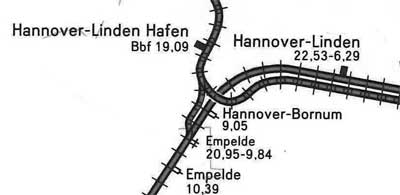 è | km 19,09 der abgehenden Strecke (Wunstorf 0,0) - Hanover-Linden Hafen Bbf 19,09 - Abzw Empelde 20,95 mit weiterlaufender Kilometrierung | |