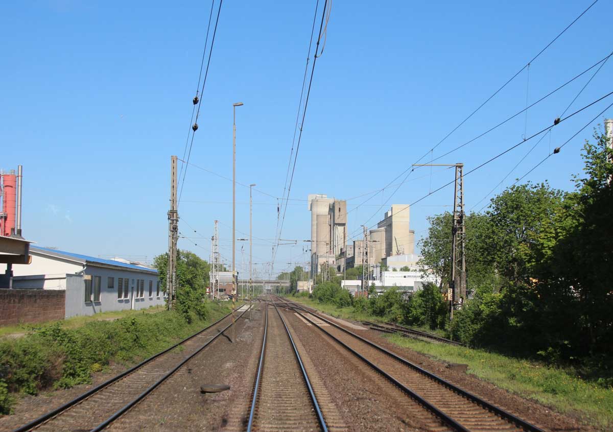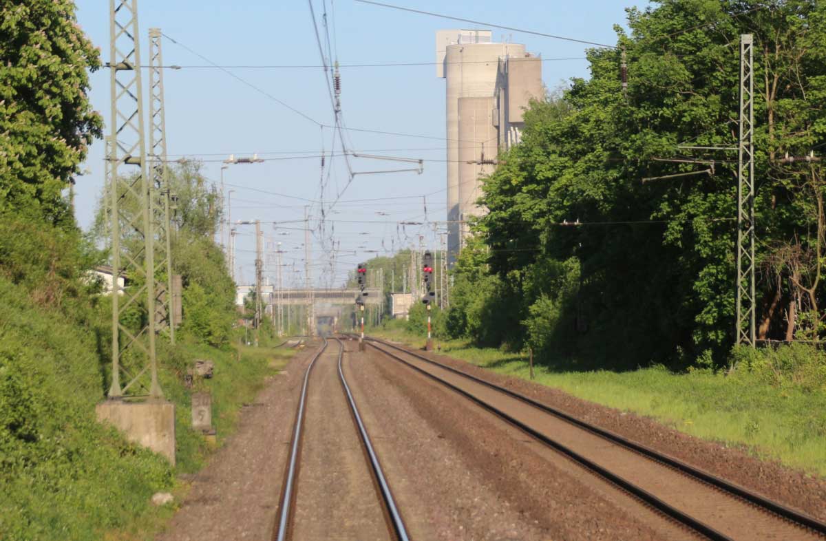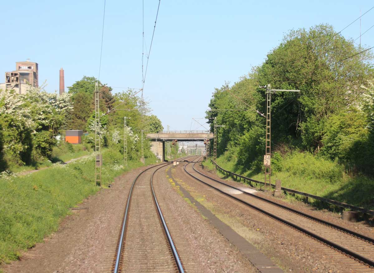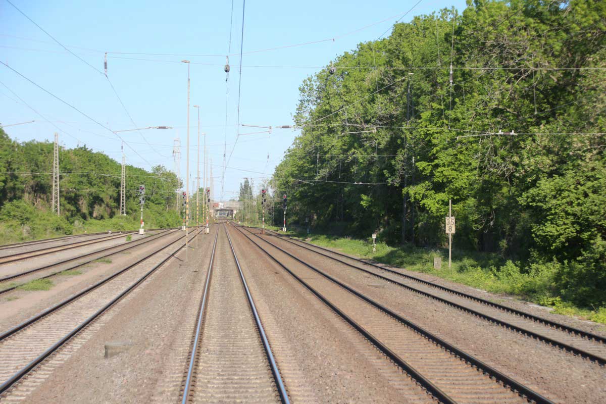 Der Zug befindet sich auf dem Gegenrichtungsgleis, links unten das Richtungsgleis.