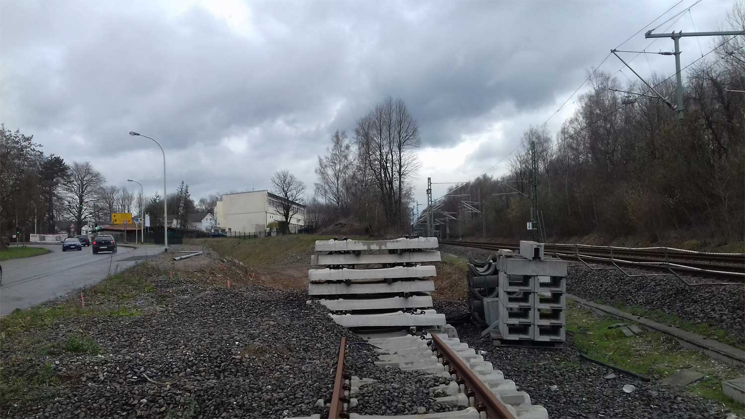 Von links kommt die im Bau befindliche Strecke Dornap-Hahnenfurth 19,594 - Abzw Wuppertal-Dornap 21,450 (2727)