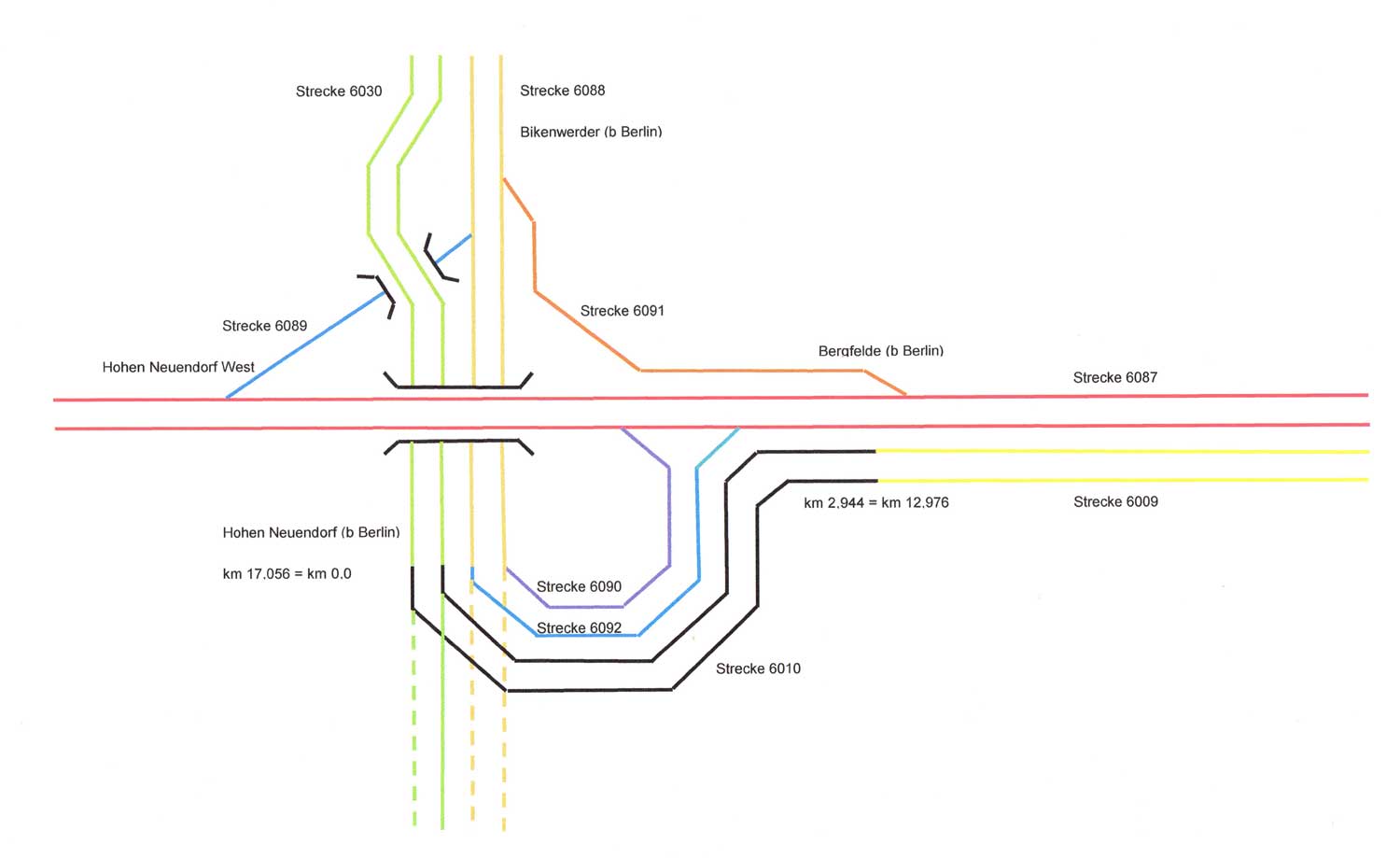 In der Mitte ankommend die Strecke Hohen Neuendorf (b Berlin), km 0,0 - Abzw Schönfließ West, W 107, km 2,970 (6092)