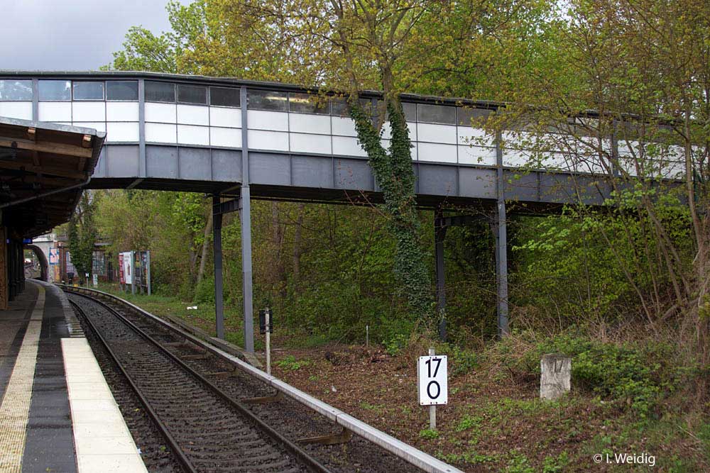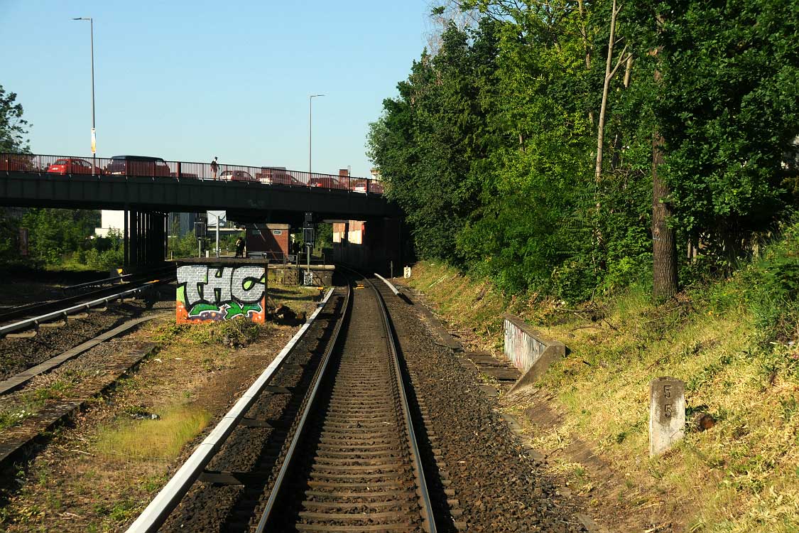Links unter dem Durchgang ist km 17,0 der Wannseebahn zu