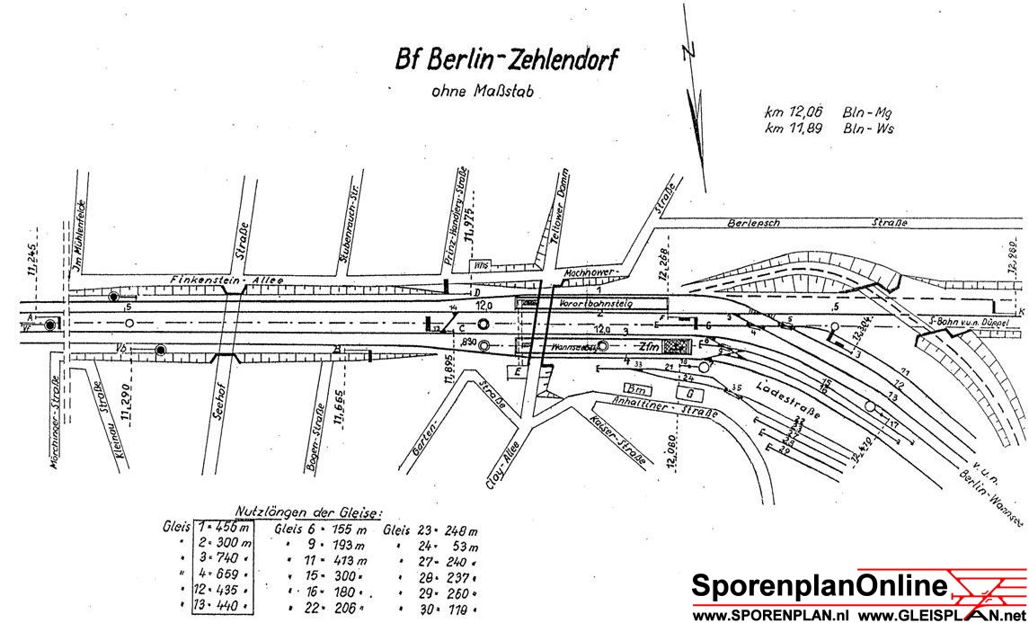 Rechts oben km 16,8 der Strecke Berlin-Zehlendorf, W 1; km 12,184 (Stw Zwt) -