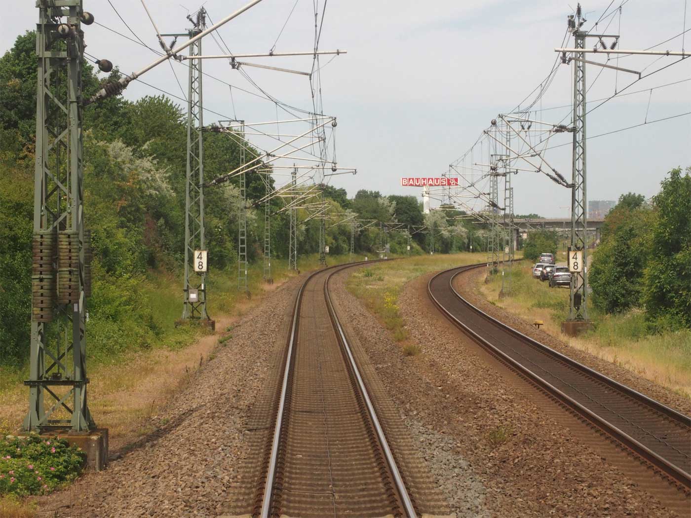 Gerade aus das Gegenrichtungsgleis der Strecke