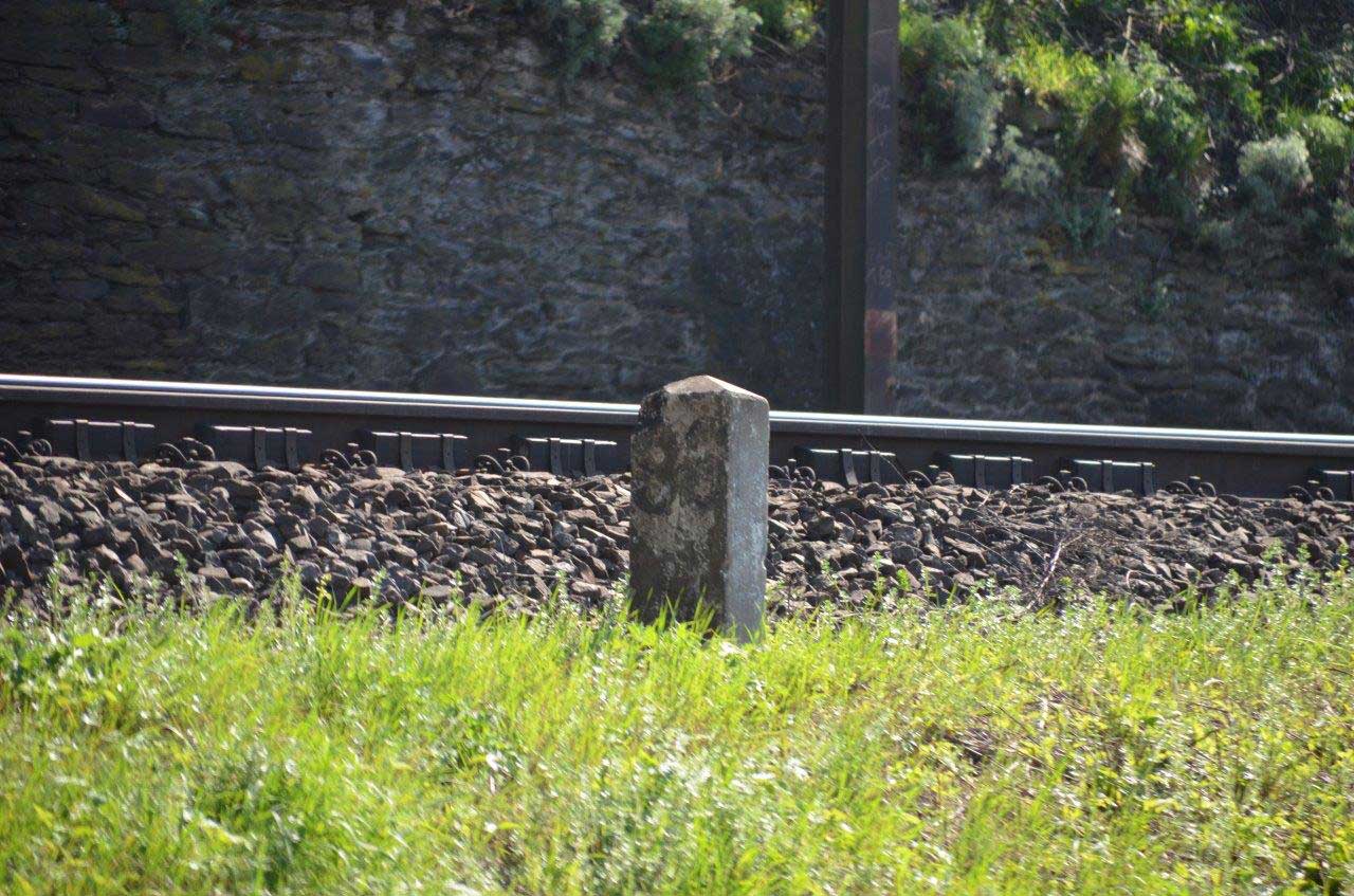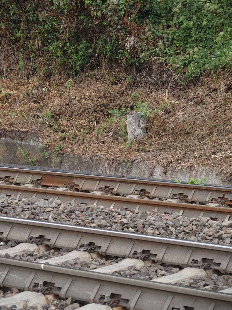 und km 125,6 (Tafel und Stein) und km 125,7 (Stein, links etwas verdeckt) - Blick Richtung Frankfurt (Main)