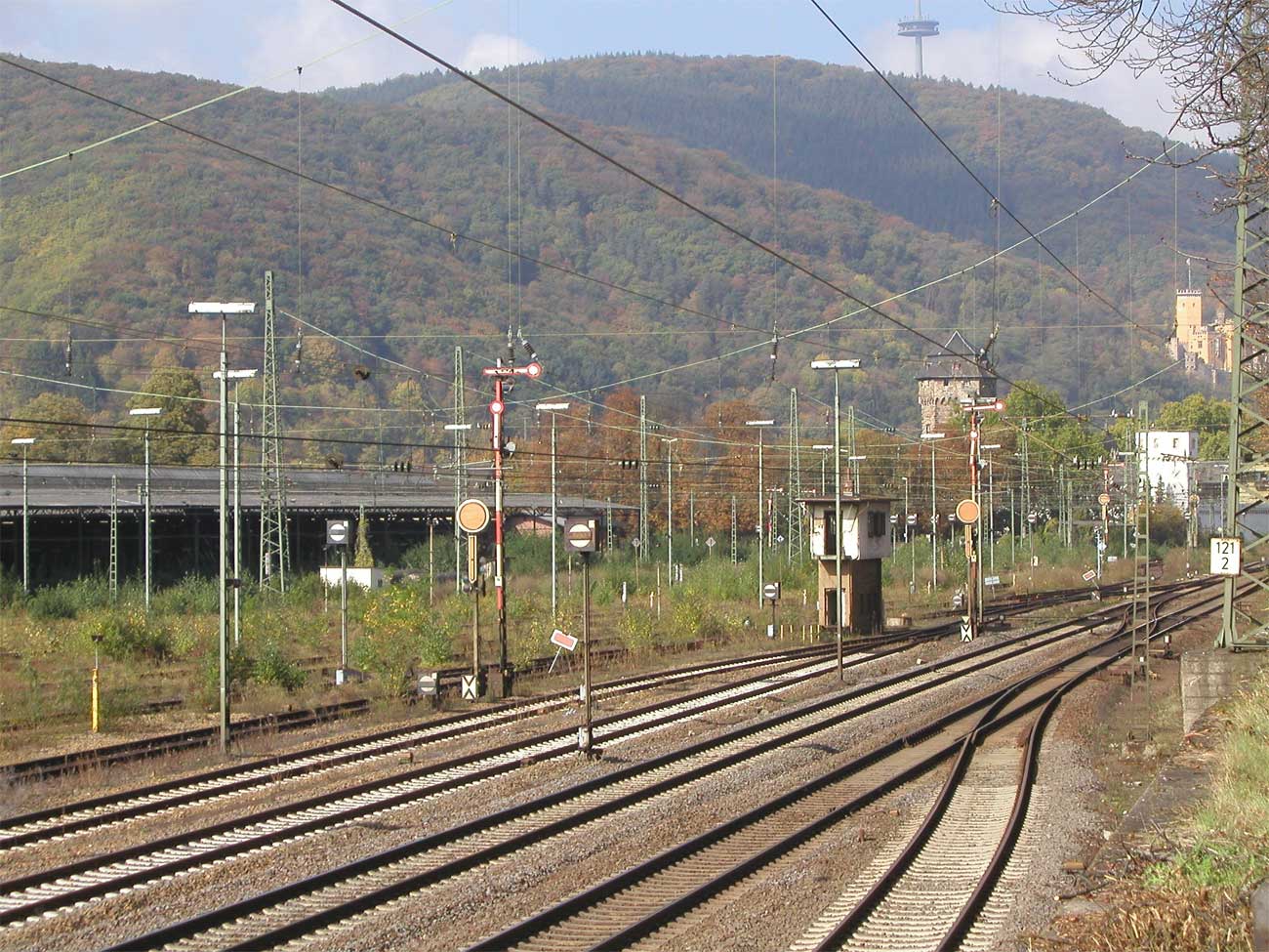 km 121,7 in Oberlahnstein - Blick zum ehemaligen Gbf und zum Brückenstellwerk Of (früher OB)
