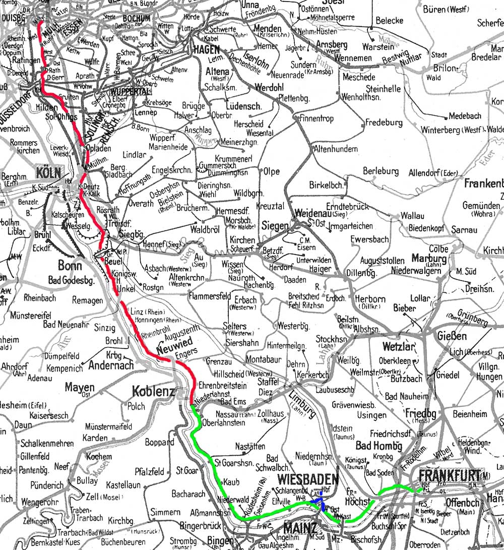 Stellwerk IX (bei Wiesbad Süd) 44,87 km 38,74 der Strecke Frankfurt (Main) Hbf 0,0 - Wiesbaden Ost 37,80 - Wiesbaden Süd 39,47 - Niederlahnstein 123,82 - km 125,70 = km 154,68 (auch Angabe: 125,72 = 154,66) von Mülheim (Ruhr)-Speldorf 0,18 (siehe auch Tabelle 3, Ziffer 2)  mit weiterlaufender Kilometrierung [Streckenverzweigung mit gemeinsamen Nullpunkt Frankfurt (Main) Hbf]