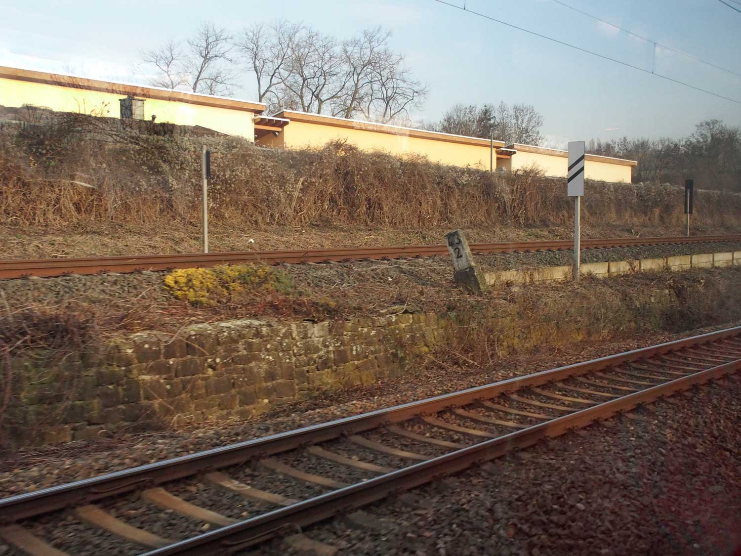 km 38,0 (Stein und Tafel) zwischen Abzw Stellwerk I (bei Wiesbaden Ost) und Wiesbaden Hbf - Blick Richtung Wiesbaden Hbf