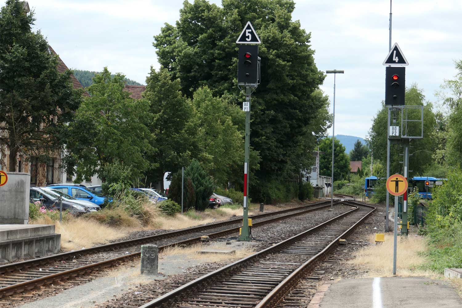 Hinter dem rechten Ausfahrtssignal befindt sich die Einfädelung der Strecke Kaiserslautern Hbf 0,0 - Lauterecken-Grumbach 34,493