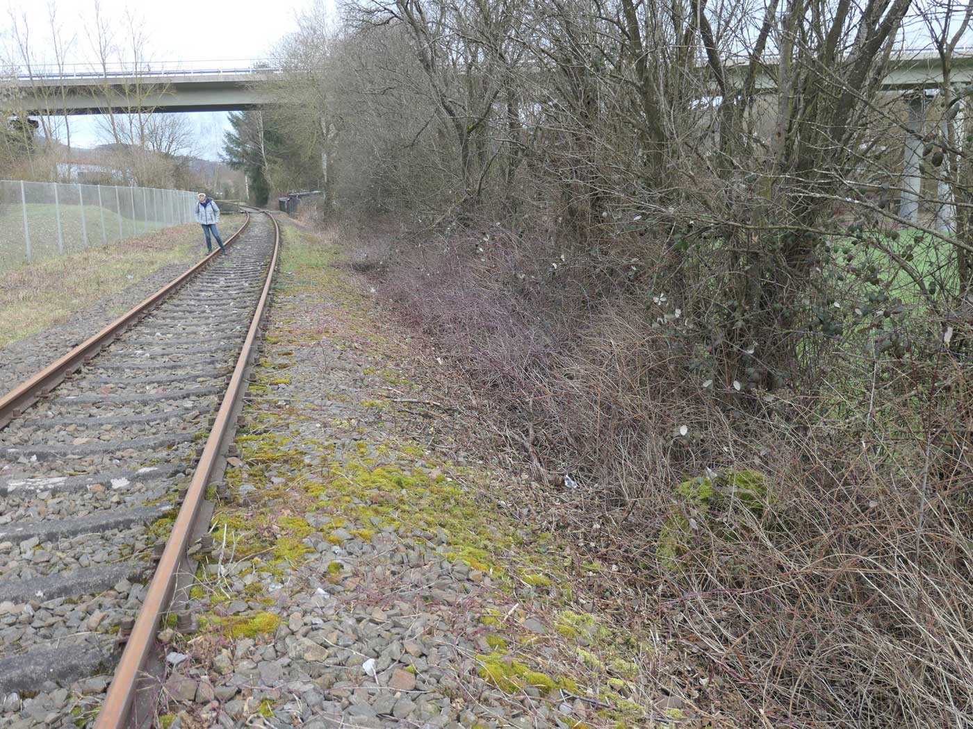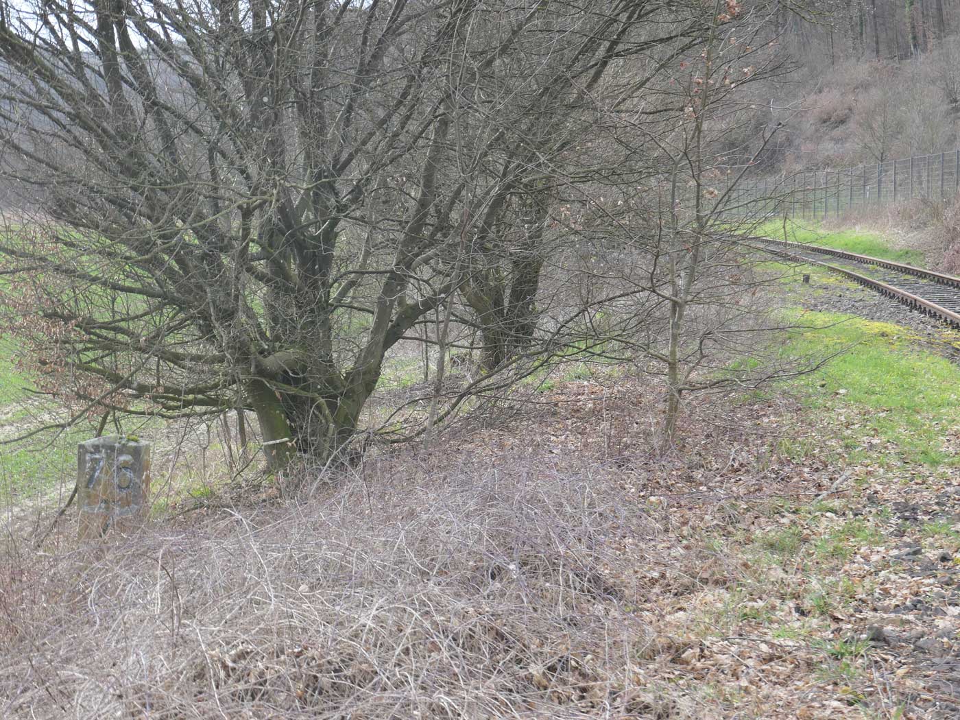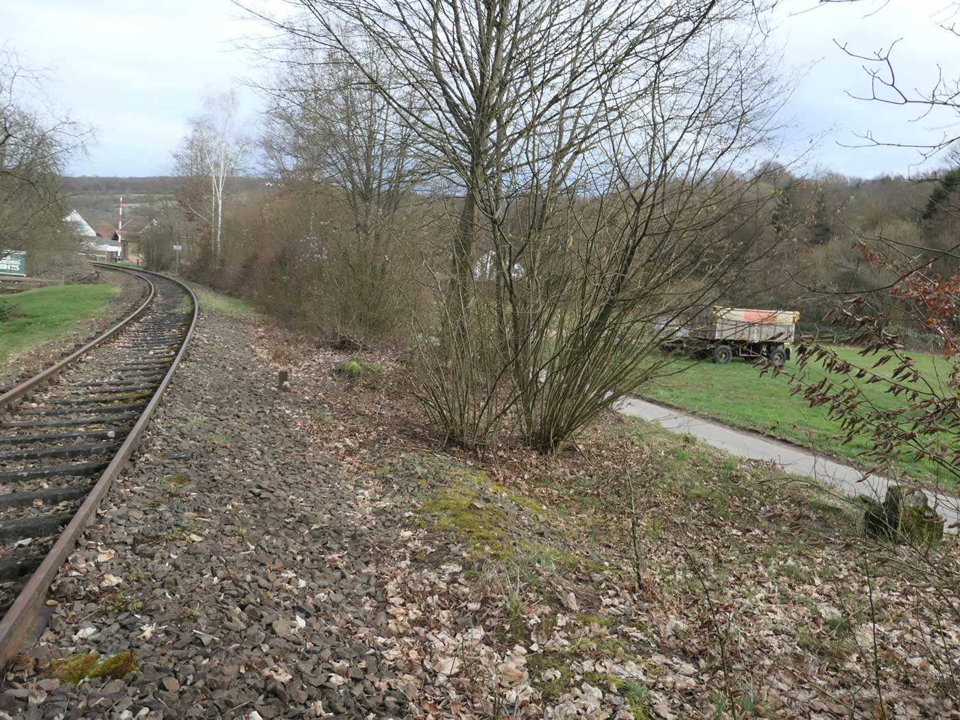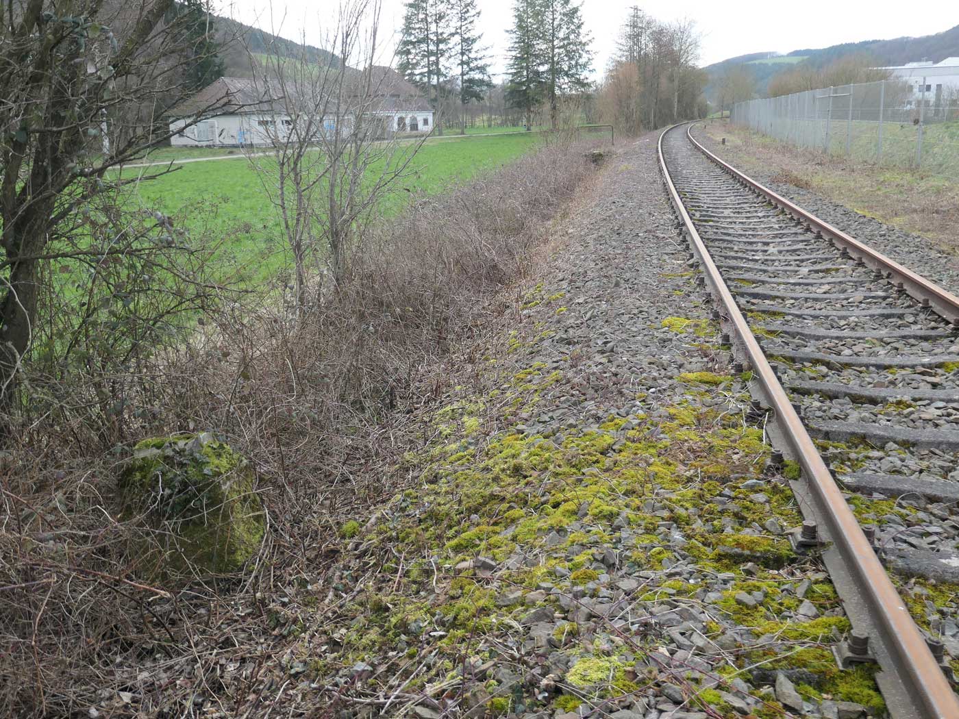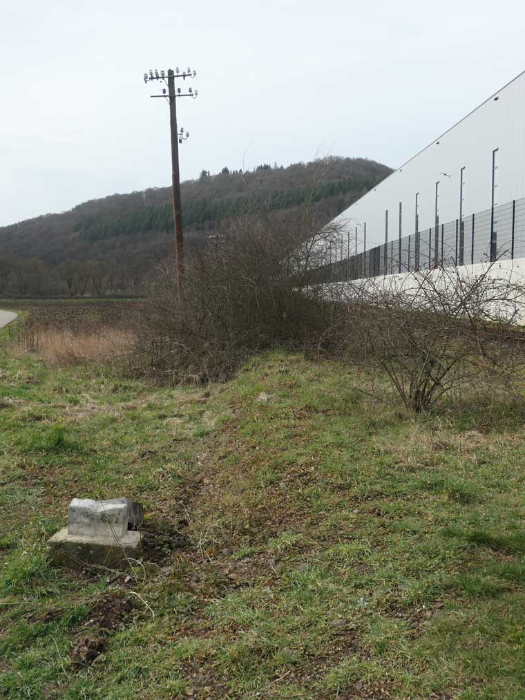 Rechts zwischen Gsp und Lampenmast am Zaun befindet sich km 34,4 der Strecke