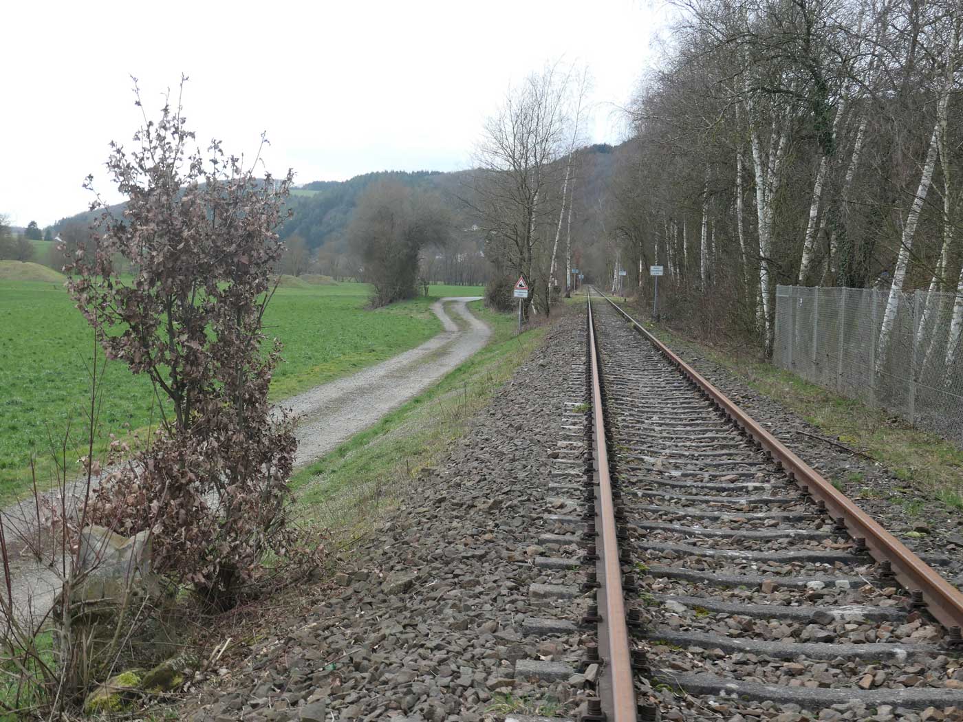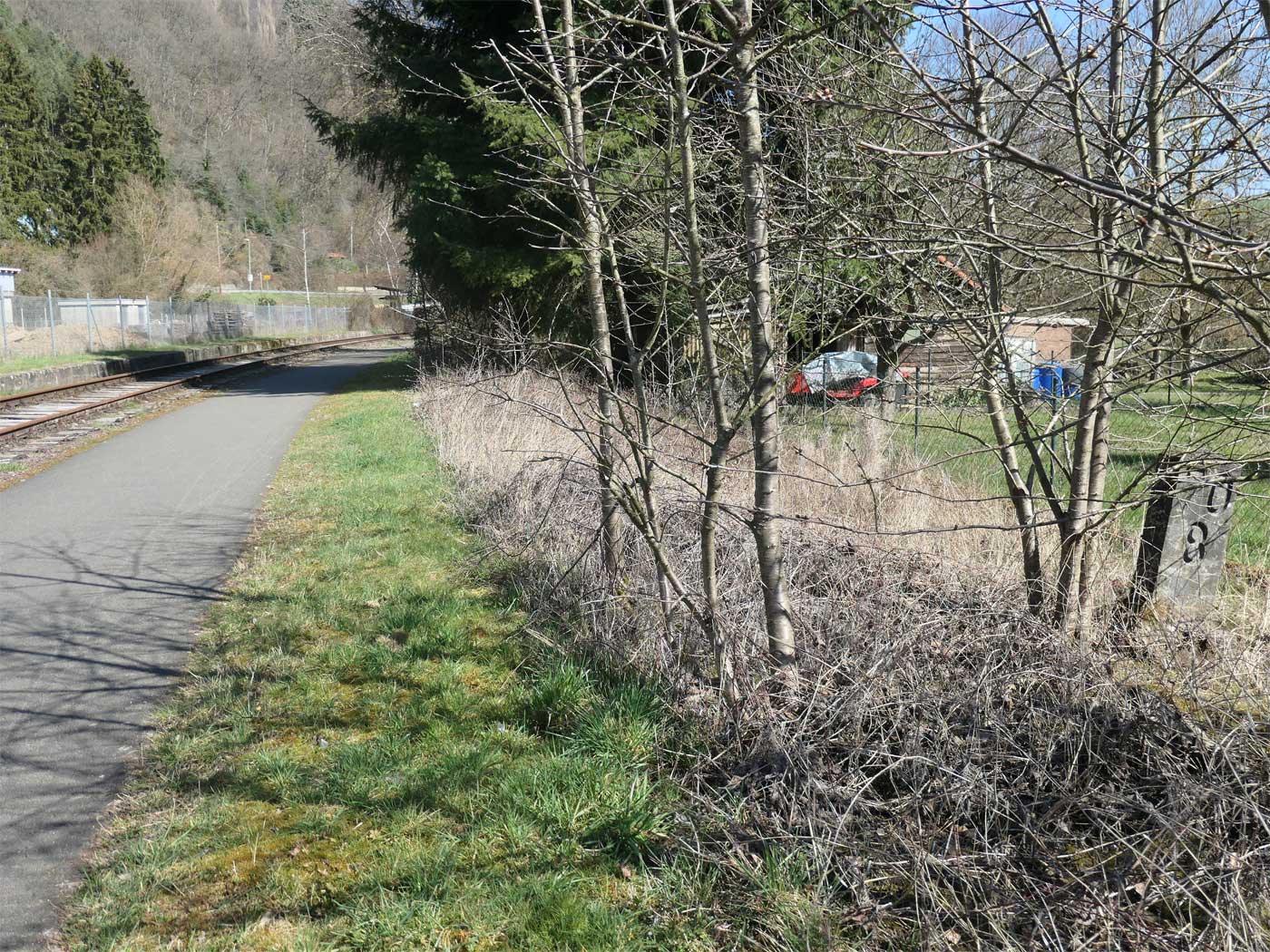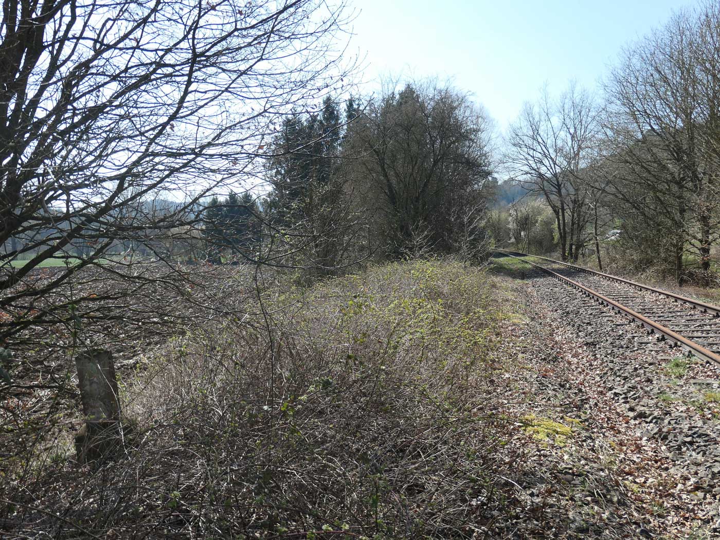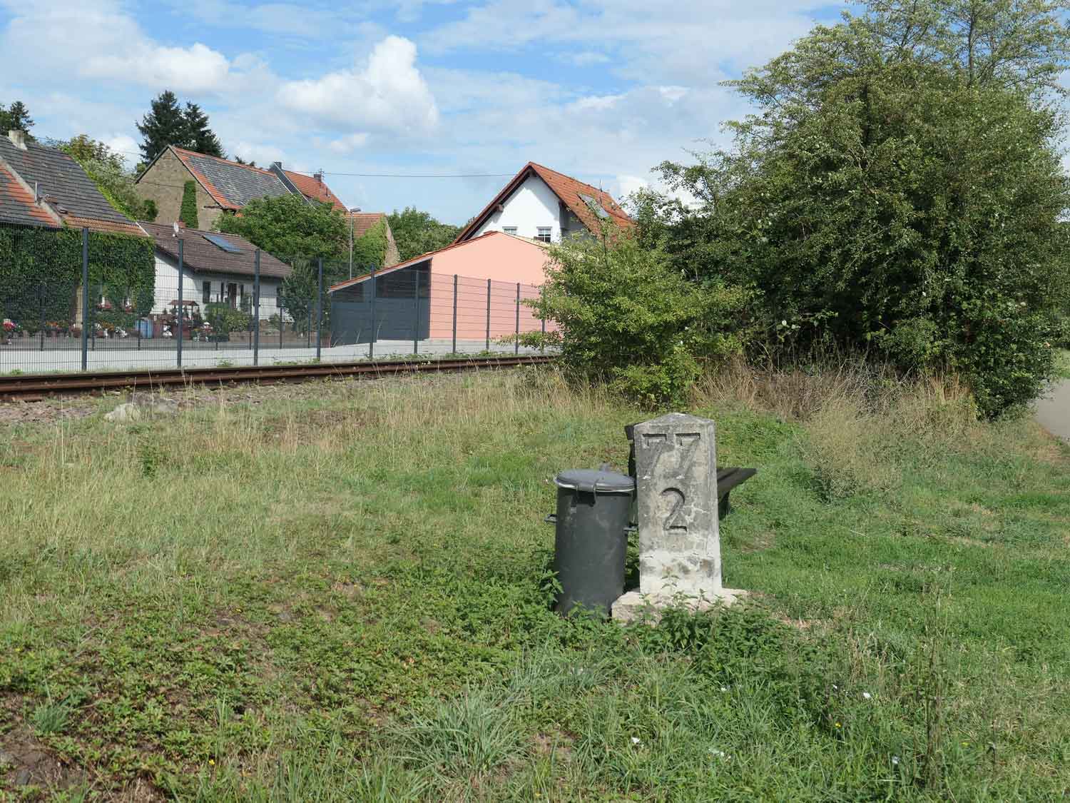Rechts zwischen Gsp und Lampenmast am Zaun befindet sich km 34,4 der Strecke